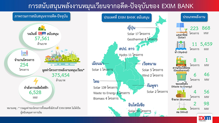 นับแต่เปิดดำเนินงานอย่างเป็นทางการในปี 2537 EXIM BANK ได้ขยายการสนับสนุนการค้าและการลงทุน ทั้งในและต่างประเทศ โดยเริ่มต้นสนับสนุนโครงการพลังงานสะอาดจากโครงการโรงไฟฟ้าพลังน้ำใน สปป.ลาว ต่อมาได้ขยายการสนับสนุนให้ผู้ประกอบการไทยพัฒนาการใช้ประโยชน์จากแสงอาทิตย์ เศษวัสดุการเกษตร ขยะเหลือทิ้ง ความร้อนใต้พิภพ และลม มาสร้างพลังงาน เช่น โครงการโรงไฟฟ้าพลังงานแสงอาทิตย์ในญี่ปุ่นและเมียนมา โรงไฟฟ้าพลังงานความร้อนใต้พิภพในญี่ปุ่น โรงไฟฟ้าพลังงานลมในเวียดนาม โดย EXIM BANK มีความพร้อมในการเข้าไปเติมเต็มช่องว่างทางการเงิน โดยเฉพาะในระยะแรกของโครงการที่ธนาคารพาณิชย์ยังไม่สามารถรับความเสี่ยงได้ นอกจากนี้ EXIM BANK ยังเป็นผู้ริเริ่มพัฒนา Ecosystem ตลาดคาร์บอน ด้วยสินเชื่อเพื่อลงทุนติดตั้งแผงโซลาร์บนหลังคา (Solar Orchestra) วงเงินกู้ 7 ปี ให้กู้ 100% ของเงินลงทุนเพื่อชำระผู้รับเหมาเมื่อติดตั้งเสร็จ อัตราดอกเบี้ยต่ำสุด 2.75% ต่อปี พร้อมสิทธิขึ้นทะเบียนคาร์บอนเครดิต และสิทธิยกเว้นภาษี 50% ของเงินลงทุนเป็นเวลา 3 ปีจากสำนักงานคณะกรรมการส่งเสริมการลงทุน (BOI) เพื่อช่วยกิจการประหยัดค่าไฟและแก้ปัญหาโลกร้อน โดยมี EXIM BANK ทำหน้าที่เชื่อมโยงผู้ซื้อกับผู้ขายและหน่วยงานกำกับดูแลเข้าด้วยกันอย่างครบวงจร พร้อมทั้งร่วมเป็นสมาชิกก่อตั้งและกรรมการสมาคมพลังงานหมุนเวียนไทย (RE100 Thailand Club) เครือข่าย Thailand Carbon Neutral Network และ Carbon Markets Club