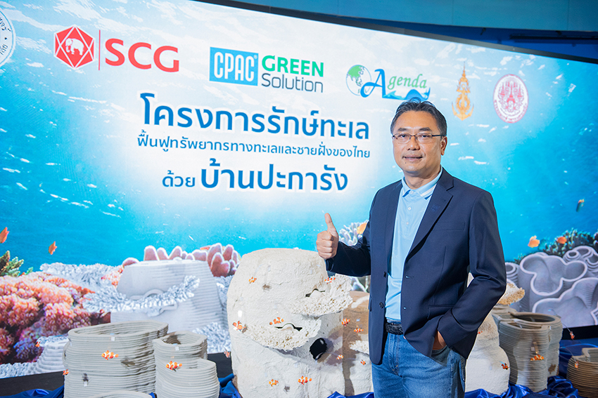 คุณชนะ ภูมี Vice President – Cement and Green Solution Business ธุรกิจซีเมนต์และผลิตภัณฑ์ก่อสร้าง เอสซีจี กล่าวว่า “เอสซีจี ดำเนินการธุรกิจควบคู่ไปกับการพัฒนาอย่างยั่งยืนโดยคำนึงถึงผลกระทบสิ่งแวดล้อม ดูแลสังคม และมีบรรษัทภิบาลตามแนวทาง ESG 4 Plus ได้แก่ 1. มุ่ง Net Zero 2. Go Green 3. Lean เหลื่อมล้ำ 4. ย้ำร่วมมือ และมีความเป็นธรรม โปร่งใสทุกการดำเนินการ ที่ผ่านมาเอสซีจี ได้ดำเนินโครงการรักษ์น้ำ จากภูผาสู่มหานที ในการพัฒนาตั้งแต่ต้นน้ำ กลางน้ำและปลายน้ำ เช่น การทำฝายชะลอน้ำ บ้านปลา การปลูกป่า หญ้าทะเลและป่าชายเลน ฯลฯ “โครงการรักษ์ทะเล” เป็นโครงการที่เอสซีจี มุ่งมั่นในการยกระดับพัฒนานวัตกรรมมาปรับใช้ นอกจากมาตรฐานการอยู่อาศัย ได้ต่อยอดการใช้นวัตกรรมจาก CPAC 3D Printing Solution มาใช้ในการอนุรักษ์ฟื้นฟูทรัพยากรของประเทศ อันเป็นการแสดงความรับผิดชอบต่อสังคมและสิ่งแวดล้อมในการดำเนินธุรกิจ ให้ความเคารพต่อธรรมชาติและทุกชีวิตในท้องทะเลด้วยบ้านปะการัง ชูจุดเด่น ร่วมออกแบบพัฒนาเทคโนโลยีระดับโลกในการขึ้นแบบจำลอง 3 มิติ รวมถึงพัฒนาสูตรปูน (Powder Extrusion) ที่เป็นมิตรต่อสิ่งแวดล้อม เพิ่มประสิทธิภาพการลงเกาะและการเจริญเติบโตของตัวอ่อนปะการัง จากความร่วมมือในโครงการรักษ์ทะเลนี้ มุ่งหวังสร้างความมีส่วนร่วมจากพันธมิตรทางธุรกิจ เครือข่ายภาครัฐ ภาคประชาชน ภาควิชาการและสังคม ในการร่วมสนับสนุนอนุรักษ์เป็นพลังขับเคลื่อนให้เกิดความร่วมมือกันในอนาคตและสามารถขยายผลอย่างเป็นรูปธรรมได้จริงอันจะก่อให้เกิดความยั่งยืนถึงคนรุ่นต่อๆ ไป”