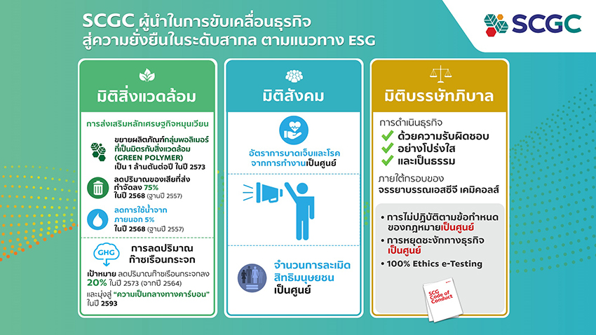 เอสซีจี เคมิคอลส์ หรือ เอสซีจีซี (SCGC) ตระหนักถึงวิกฤตที่โลกต้องเผชิญในปัจจุบัน ไม่ว่าจะเป็นสภาวะขาดแคลนทรัพยากร ภาวะโลกร้อน รวมไปถึงปัญหาความเหลื่อมล้ำในสังคมด้านต่าง ๆ ฯลฯ ดังนั้น เพื่อร่วมเป็นส่วนหนึ่งในการสร้างโลกและสังคมที่ยั่งยืน SCGC จึงประกาศเป้าหมายด้าน ESG อย่างเป็นรูปธรรม มุ่งสู่ “ผู้นำธุรกิจเคมีภัณฑ์ครบวงจรเพื่อความยั่งยืนในภูมิภาคอาเซียน” เดินหน้าขับเคลื่อนการใช้ทรัพยากรอย่างคุ้มค่าตามหลักเศรษฐกิจหมุนเวียน เน้นพัฒนานวัตกรรมพอลิเมอร์ที่เป็นมิตรกับสิ่งแวดล้อม หรือ Green Polymer โดยตั้งเป้า 1 ล้านตันต่อปี ภายในปี 2573 นอกจากนี้ ยังมุ่งลดผลกระทบต่อภาวะโลกร้อน ด้วยการเพิ่มประสิทธิภาพด้านพลังงาน การใช้พลังงานหมุนเวียน และพัฒนาเทคโนโลยีคาร์บอนต่ำ เพื่อบรรลุเป้าหมายความเป็นกลางทางคาร์บอน รวมถึงการยกระดับคุณภาพชีวิตให้กับชุมชน ส่งเสริมอาชีพ และสร้างวิถีสังคมคาร์บอนต่ำ