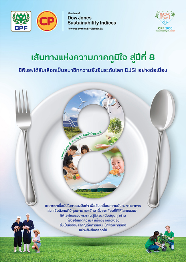 “การได้รับคัดเลือกเป็นสมาชิก DJSI มาตลอด 8 ปี สะท้อนความมุ่งมั่นของบริษัทในการดำเนินธุรกิจด้วยความรับผิดชอบ ตลอดห่วงโซ่อุปทานในทุกกลุ่มธุรกิจ ตั้งแต่ต้นน้ำถึงปลายน้ำ ตามมาตรฐานสากลและสอดคล้องกับแนวโน้มความต้องการของผู้บริโภคทั่วโลก เพื่อสร้างการเติบโตอย่างยั่งยืนและขับเคลื่อนธุรกิจสู่เป้าหมาย ครัวของโลกที่ยั่งยืน” นายประสิทธิ์ กล่าว