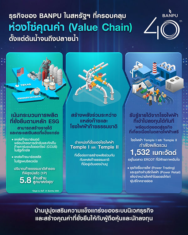 ล่าสุดจากความสำเร็จในการลงทุนเมื่อต้นเดือนกรกฎาคม 2566 ในโรงไฟฟ้าก๊าซธรรมชาติที่เปิดดำเนินการเชิงพาณิชย์แล้วอย่าง Temple II ซึ่งเป็นโรงไฟฟ้าที่มีประสิทธิภาพสูงและเป็นมิตรต่อสิ่งแวดล้อม (High Efficiency, Low Emissions: HELE) ที่มีกำลังผลิต 755 เมกะวัตต์ ตั้งอยู่ในรัฐเท็กซัส สหรัฐอเมริกา อยู่ติดกับโรงไฟฟ้าก๊าซธรรมชาติ Temple I ที่มีอยู่เดิม ส่งผลให้การดำเนินการและบริหารจัดการโรงไฟฟ้ามีประสิทธิภาพมากขึ้น เอื้อต่อการใช้ทรัพยากรร่วมกันให้ได้ประโยชน์สูงสุด (Economies of Scale) อีกทั้งยังพร้อมผสานพลังและสร้างคุณค่าร่วมกันกับแหล่งก๊าซธรรมชาติที่มีอยู่เดิมของบ้านปู ไม่ว่าจะเป็นแหล่งก๊าซบาร์เนตต์ (Barnett) ในรัฐเท็กซัส ที่บ้านปูบริหารจัดการระบบกลางน้ำซึ่งเป็นท่อขนส่งก๊าซความยาวมากกว่า 778 ไมล์ และระบบโครงสร้างพื้นฐานที่เกี่ยวข้องเอง นอกจากนั้น บ้านปูยังมีแหล่งก๊าซมาร์เซลลัส (Marcellus) ในรัฐเพนซิลเวเนีย ซึ่งรวมทั้งสองแหล่งแล้วมีกำลังผลิตถึง 900 ล้านลูกบาศก์ฟุตต่อวัน และมีปริมาณก๊าซธรรมชาติสำรองที่พิสูจน์แล้ว (1P) ในสหรัฐฯ 5.8 ล้านล้านลูกบาศก์ฟุตเทียบเท่า[1] โดยในปัจจุบันบ้านปูยังคงสถานะเป็นผู้ผลิตก๊าซธรรมชาติที่ใหญ่ที่สุด 20 อันดับแรกของสหรัฐฯ และในปีที่ผ่านมา ธุรกิจก๊าซธรรมชาติก็สามารถสร้าง EBITDA ให้บ้านปูถึง 1,052 ล้านเหรียญสหรัฐ ยิ่งไปกว่านั้น บ้านปูยังสนับสนุนการยกระดับความยั่งยืนในกระบวนการผลิต ตอกย้ำการดำเนินธุรกิจตามหลัก ESG ด้วยการพัฒนาโครงการดักจับและกักเก็บก๊าซคาร์บอนไดออกไซด์ (Carbon Capture, Utilization and Storage: CCUS) ในแหล่งก๊าซธรรมชาติบาร์เนตต์ ที่สอดรับนโยบายลดการปล่อยก๊าซเรือนกระจกของสหรัฐฯ ซึ่งคาดว่าจะพร้อมเปิดดำเนินการเชิงพาณิชย์ภายในปีนี้