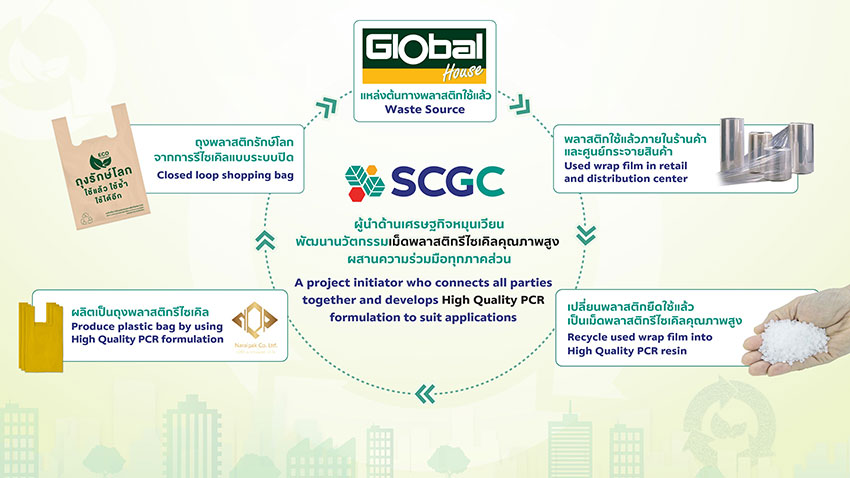 นายธนวงษ์ อารีรัชชกุล ประธานเจ้าหน้าที่บริหาร และกรรมการผู้จัดการใหญ่ บริษัท เอสซีจี เคมิคอลส์ จำกัด (มหาชน) หรือ SCGC กล่าวว่า “SCGC ส่งเสริมและขับเคลื่อนหลักเศรษฐกิจหมุนเวียนอย่างเป็นรูปธรรมร่วมกับทุกภาคส่วน โดยเน้นให้เกิดการนำพลาสติกใช้แล้วกลับเข้าสู่กระบวนการรีไซเคิลแบบระบบปิด หรือที่เรียกว่า Closed Loop ซึ่งเป็นหัวใจสำคัญของหลักเศรษฐกิจหมุนเวียน สำหรับความร่วมมือกับโกลบอลเฮ้าส์นั้น SCGC ได้นำนวัตกรรมรีไซเคิลจาก SCGC GREEN POLYMERTM มาช่วยเปลี่ยนพลาสติกใช้แล้วของ Global House ให้เป็นเม็ดพลาสติกรีไซเคิลคุณภาพสูง (High Quality Post-Consumer Recycled Resin: High Quality PCR) เพื่อนำไปผลิตเป็น “ถุงพลาสติกรักษ์โลก” สำหรับใช้งานต่อไป ซึ่งส่งเสริมการใช้ทรัพยากรให้เกิดประโยชน์สูงสุด ช่วยลดการเกิดของเสีย และลดการปล่อยก๊าซเรือนกระจกเพื่อสิ่งแวดล้อมที่ยั่งยืนตามแนวทาง Low Waste, Low Carbon”