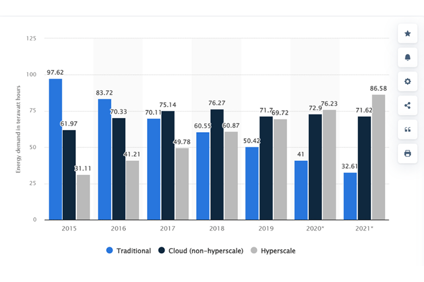 แท้จริงแล้ว “พลังงานไฟฟ้า” เป็นทั้งโอกาสและความท้าทายในการพัฒนาระบบนิเวศดิจิทัลของประเทศที่ส่งผลกระทบชิ่งต่อ ๆ กันเป็นลูกโซ่ นอกจากพลังงานไฟฟ้าจะเป็นตัวกำหนดทิศทางทางเศรษฐกิจใหม่แล้ว ยังเป็นกลไกสำคัญในการพัฒนาโครงสร้างพื้นฐานดิจิทัลของประเทศ อย่าง Data Center ที่ใช้พลังงานอย่างมหาศาลเพื่อรัน Facilities ให้กับธุรกิจต่าง ๆ ข้อมูลจาก Statista พบว่า Hyperscale Data Center มีความต้องการใช้พลังงานเพิ่มมากขึ้นในช่วงสองปีหลัง (2563-2564) อยู่ที่ 76.23 TWh และ 86.58 TWh (TeraWatt-hour, ล้านล้านหน่วยชั่วโมง) ตามลำดับ