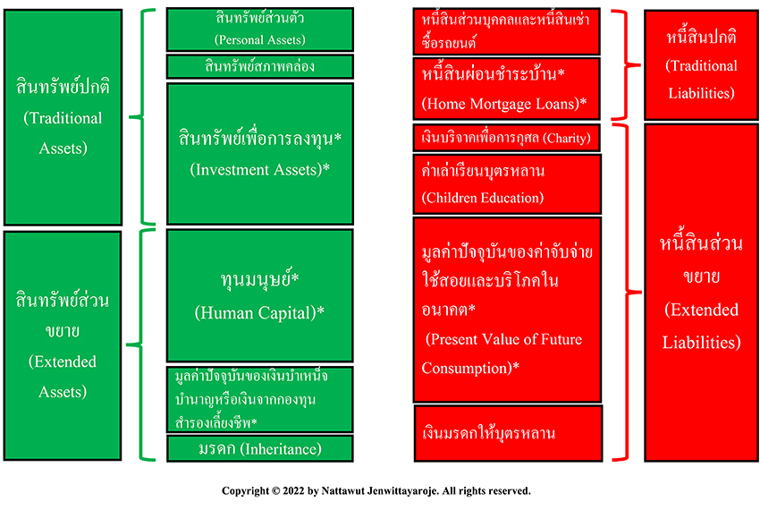 ส่วนสินทรัพย์ส่วนขยายที่สำคัญ แน่นอนว่าคือ ทุนมนุษย์ ซึ่งมักจะเป็นก้อนที่ใหญ่มากๆ สำหรับคนที่อายุน้อย ส่วนที่สำคัญถัดมาคือ (มูลค่าปัจจุบันของ)เงินบำเหน็จบำนาญหรือเงินจากกองทุนสำรองเลี้ยงชีพ ซึ่งจะมากหรือน้อยก็มักจะผันแปรไปตามฐานเงินเดือน อายุงาน ร้อยละของการสมทบจากฝ่ายนายจ้างเข้ากองทุนสำรองเลี้ยงชีพ เป็นต้น ส่วนสุดท้ายคือ เงินมรดกที่เราคาดว่าจะได้ในอนาคต โดยทั่วไปแล้วมักเป็นก้อนที่ไม่ใหญ่ แต่ก็มีความหลากหลายมากทีเดียว คนส่วนใหญ่อาจมีก้อนนี้เป็นศูนย์ แต่สำหรับบางคนแล้วอาจมีเงินก้อนนี้มหาศาลได้เลยทีเดียว