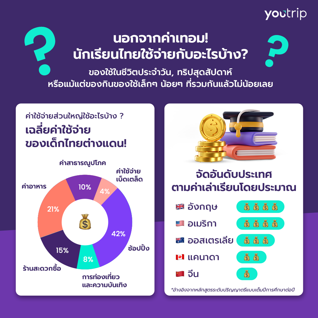 พฤติกรรมการใช้จ่ายของนักเรียนสะท้อนวิถีชีวิตในต่างแดนและแรงกดดันด้านค่าครองชีพที่สูงขึ้น จากสถิติของ YouTrip พบว่า “การช้อปปิ้ง” เป็นหมวดค่าใช้จ่ายอันดับแรกของนักเรียนไทยในต่างประเทศ ไม่ว่าจะเป็นการจัดหาสิ่งของเข้าที่พัก ไปจนถึงการให้รางวัลตัวเองด้วยสินค้าแบรนด์เนมหรือของสะสมยอดนิยมอย่าง Pop Mart ซึ่งได้รับความนิยมอย่างมากในทุกประเทศที่นักเรียนไทยไปเรียน โดยเฉพาะในสหราชอาณาจักรที่นักเรียนมีแนวโน้มใช้จ่ายกับสินค้าหรูมากกว่าประเทศอื่น เนื่องจากราคาที่ดึงดูดใจและอยู่ใกล้ศูนย์กลางการช้อปในยุโรป แม้จะมีการใช้จ่ายเพื่อความเพลิดเพลิน แต่นักเรียนไทยส่วนใหญ่ยังคงระมัดระวังในการใช้จ่าย มักเลือกซื้อสินค้าจากร้านค้าท้องถิ่นเพื่อความประหยัด และสินค้าที่ไม่มีในประเทศไทย