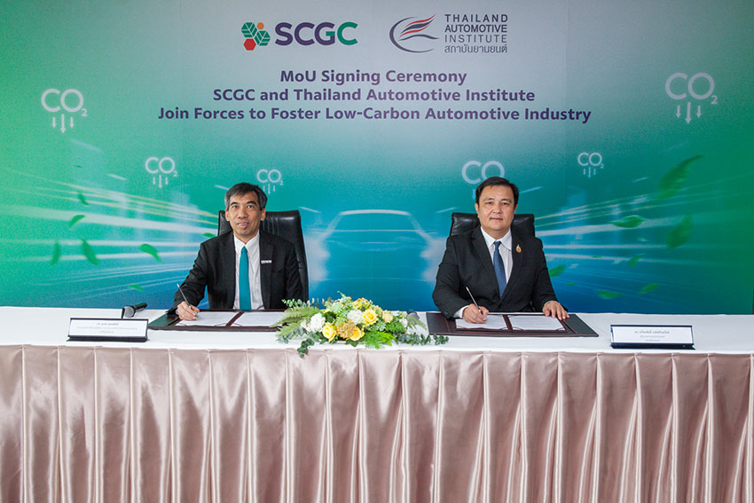 เอสซีจี เคมิคอลส์ หรือ SCGC ผู้เชี่ยวชาญด้านนวัตกรรมพอลิเมอร์เพื่อความยั่งยืน ร่วมกับ อุตสาหกรรมพัฒนามูลนิธิ สถาบันยานยนต์ ลงนามบันทึกข้อตกลงความร่วมมือ “การขับเคลื่อนอุตสาหกรรมยานยนต์ในประเทศไทย สู่การเป็นอุตสาหกรรมยานยนต์คาร์บอนต่ำ” เพื่อยกระดับศักยภาพและเพิ่มขีดความสามารถการแข่งขันในตลาดโลกให้กับผู้ประกอบการอุตสาหกรรมและผู้ผลิตชิ้นส่วนพลาสติกเพื่อยานยนต์ของไทย เดินหน้าพัฒนานวัตกรรมพอลิเมอร์ที่เป็นมิตรกับสิ่งแวดล้อม และนำดิจิทัลโซลูชันสู่อุตสาหกรรมยานยนต์อย่างครบวงจร เน้นการใช้พลังงานให้เกิดประสิทธิภาพสูงสุด และลดการปล่อยก๊าซคาร์บอนไดออกไซด์ ขานรับนโยบายของภาครัฐที่ผลักดันให้ใช้วัสดุและชิ้นส่วนที่ผลิตในประเทศไทย เพื่อเป็นยานยนต์ที่ “สะอาด ประหยัด และปลอดภัย” สร้างความยั่งยืนทางเศรษฐกิจควบคู่กับการดูแลสิ่งแวดล้อม พร้อมก้าวสู่สังคมคาร์บอนต่ำอย่างเป็นรูปธรรม