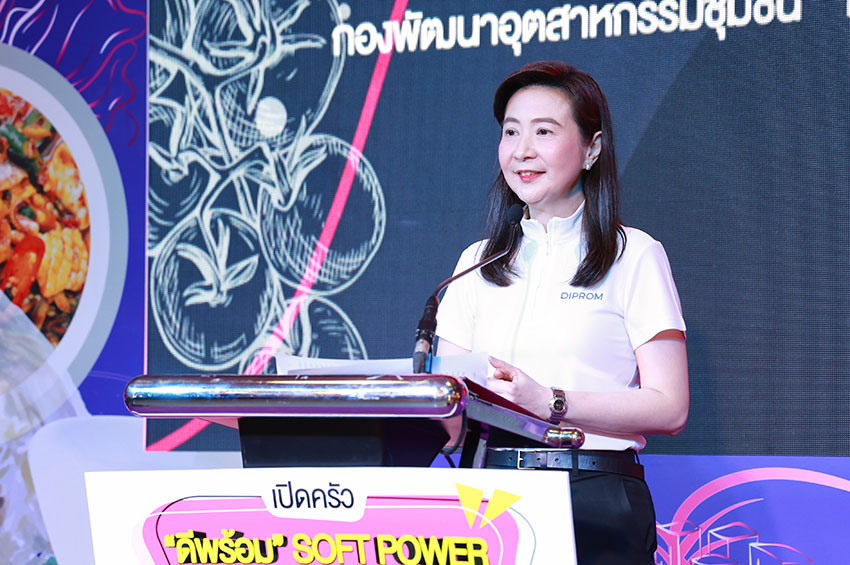 ด้าน นางสาวณัฏฐิญา เนตยสุภา อธิบดีกรมส่งเสริมอุตสาหกรรม กล่าวว่า กรมส่งเสริมอุตสาหกรรม หรือดีพร้อม (DIPROM) ขานรับนโยบายเรือธงสำคัญ (Flagship) ในการขับเคลื่อนซอฟต์พาวเวอร์ไทย สาขาอาหาร ภายใต้นโยบาย “ดีพร้อมคอมมูนิตี้ ที่นี่มีแต่ให้” ผ่านกลยุทธ์การให้ทักษะใหม่ ๆ เพื่อยกระดับทักษะที่มีอยู่เดิม (Upskill) และสร้างทักษะขึ้นมาใหม่ (Reskill) ที่จำเป็นต่อการทำงานโดยเฉพาะอุตสาหกรรมสร้างสรรค์ รวมถึงการให้โอกาสโตไกลด้วยการพัฒนาและยกระดับผลิตภัณฑ์ด้วยเทคโนโลยี นวัตกรรม และเครื่องมือต่าง ๆ ของดีพร้อม เพื่อให้ตอบโจทย์