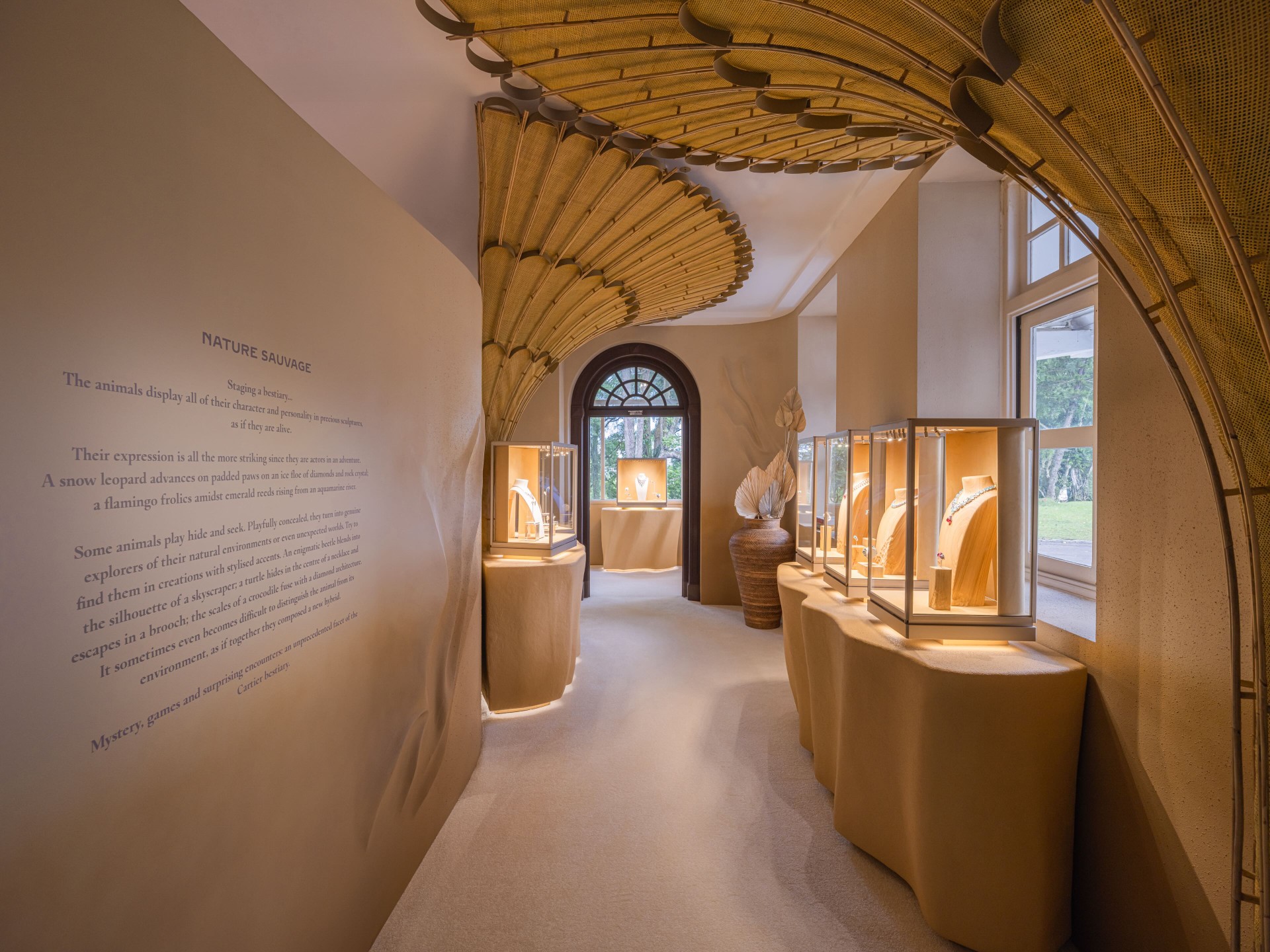 รูปทรงเรขาคณิตแห่งธรรมชาติ และภูมิทัศน์ที่ผ่านการจินตนาการขึ้นใหม่ในห้องที่สองนี้ Nature Sauvage ถ่ายทอดเรื่องราวด้วยจังหวะเปี่ยมเอกลักษณ์โดยดึงแรงบันดาลใจมาจากสถาปัตยกรรมพื้นถิ่นที่จินตนาการขึ้นมาใหม่ด้วยมุมมองเส้นสายและโครงร่างแบบเรขาคณิต ผสมผสานอย่างกลมกลืนกับเหล่าเครื่องประดับชั้นสูงของคาร์เทียร์และเสน่ห์ อันโดดเด่นของเกาะสิงคโปร์ พื้นที่จัดแสดงต่างผสานความความหนักแน่นและอ่อนโยนไว้อย่างสมบูรณ์แบบ ทั้งการตกแต่งด้วยหวายสาน ทรงก้อนกรวดที่ตัดกับความโค้งมนนุ่มละมุน ขณะที่กล้วยไม้ซึ่งเป็นดอกไม้ประจำชาติของสิงคโปร์ได้เผยโฉมอย่างสง่างามท่ามกลางภูมิทัศน์ ที่รังสรรค์ขึ้นอย่างประณีต นับเป็นลูกเล่นอันละเอียดอ่อนระหว่างธรรมชาติและโครงสร้าง ที่ซึ่งผืนป่าแห่งเมืองได้กลายเป็นดั่งผืนผ้าใบให้กับ ความงดงาม ความสมดุลและวิสัยทัศน์แห่งธรรมชาติที่แต่งแต้มโดยคาร์เทียร์