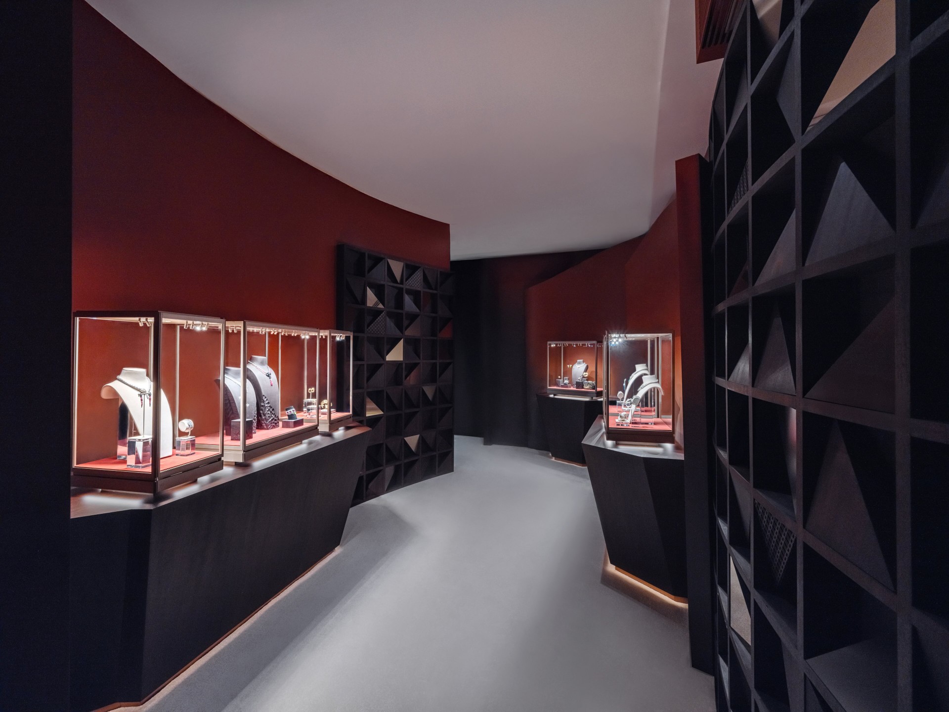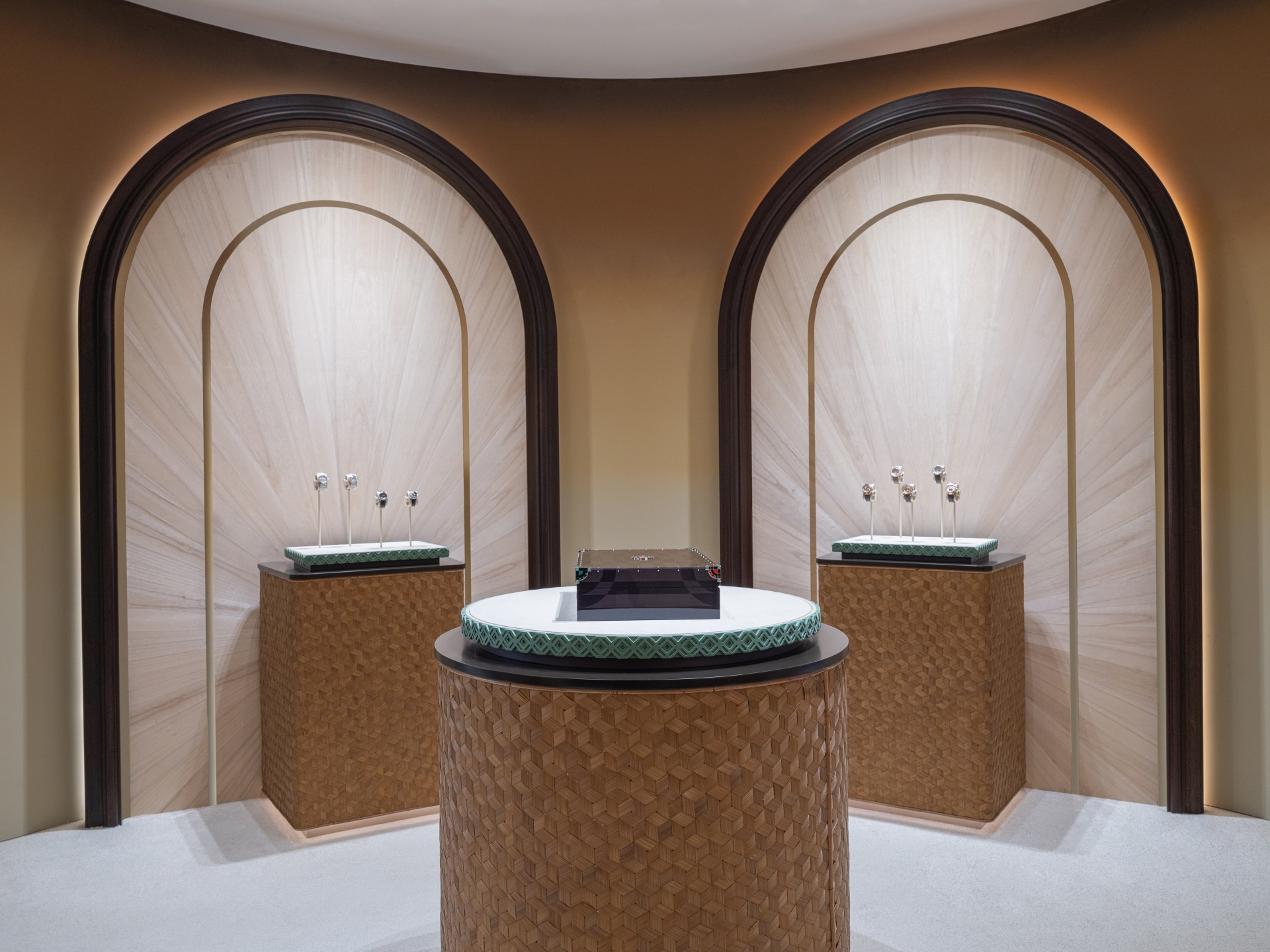 การมาบรรจบกันของห้วงเวลา งานฝีมือ และสัญลักษณ์นิยม ภายในถ้ำอันลึกลับแห่งนี้ คาร์เทียร์ได้เผยจักรวาลแห่งเรือนเวลาชั้นสูงของเมซง ด้วยสถาปัตยกรรมทรงโค้งมนของห้องที่สะท้อนถึงการเคลื่อนไหวอย่างไม่มีสิ้นสุดของเวลา ส่วนโค้งต่างๆ ตกแต่งด้วยการประดับฝังด้วยฟางเป็นลวดลายแบบซันเรย์อันเปล่งประกาย ชวนให้นึกถึงหน้าปัด แบบซันเรย์ของเรือนเวลาที่นับเป็นหนึ่งในสัญลักษณ์แห่งงานศิลป์ของเมซง ใจกลางห้องนี้โดดเด่นด้วยเสาสานไม้ไผ่อันประณีตซึ่งตั้งตระหง่านอย่างเงียบสงบและมั่นคง เปรียบดั่งสัญลักษณ์เชิงวัฒนธรรมที่สะท้อนความแข็งแกร่งและสง่างาม องค์ประกอบเหล่านี้หลอมรวมเป็นหนึ่ง เพื่อเชิดชูเมติเยร์ ดาร์ท (métier d’art) ของคาร์เทียร์ โดยถ่ายทอดการมาบรรจบกันอย่างไร้กาลเวลาระหว่างงานออกแบบ มรดก และความมหัศจรรย์ทางเทคนิค