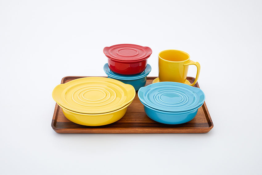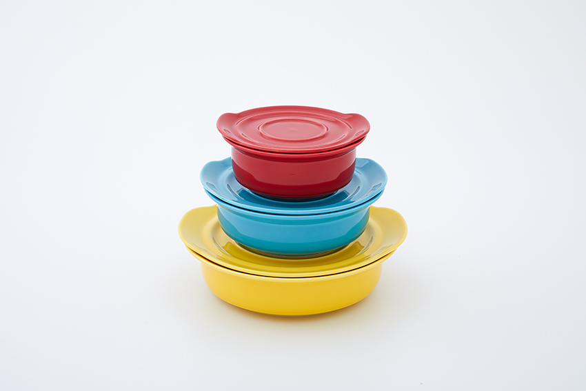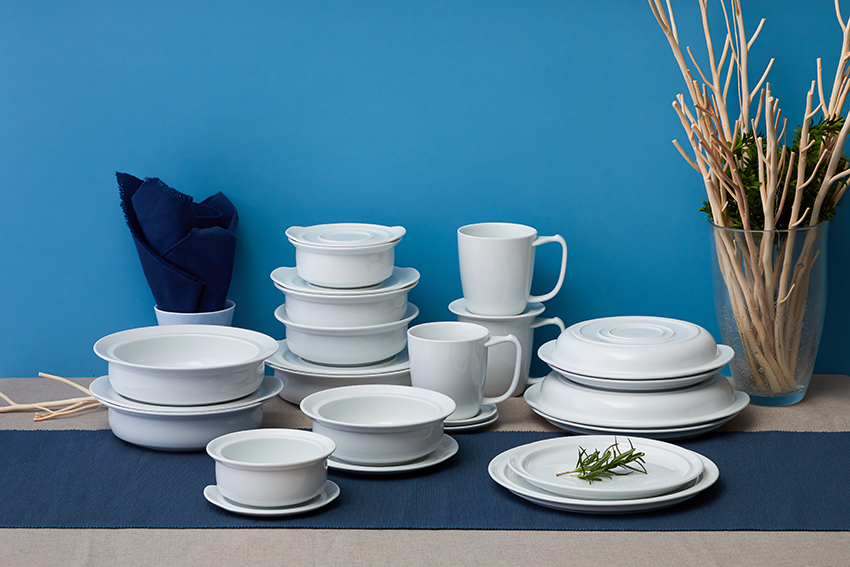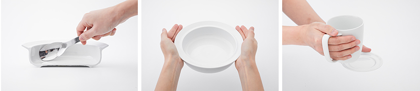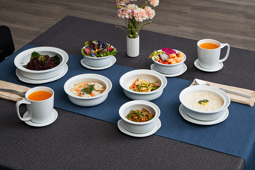 จานชามแก้วน้ำและจานรองในคอเล็กชั่นนี้ใช้วัสดุเป็น Porcelain ทั้งหมด เพื่อให้รักษาความสะอาดได้ง่ายและปราศจากสิ่งตกค้างแบบร้อยเปอร์เซ็นต์ และออกแบบโดยคำนึงถึงหลักกายวิภาคศาสตร์และสรีรวิทยาของผู้สูงอายุโดยเฉพาะ ซึ่งทีมงานออกแบบใช้เวลาเก็บข้อมูล วิจัย และพัฒนา ถึง 4 ปีเต็ม