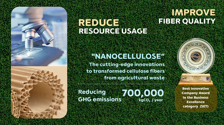 นอกจากนี้ SCGP ได้ศึกษาและพัฒนานวัตกรรม “เส้นใยนาโนเซลลูโลส” จากวัตถุดิบเหลือใช้ทางการเกษตร เพื่อน้ำไปใช้เป็นวัตถุดิบในกระบวนการผลิตกระดาษบรรจุภัณฑ์ ซึ่งได้มีการจดสิทธิบัตรเป็นที่เรียบร้อยแล้วทั้งในประเทศและต่างประเทศ