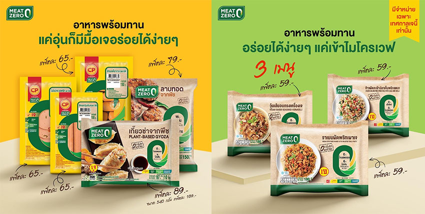 MEAT ZERO ผลิตภัณฑ์เนื้อจากพืช (Plant-Based) ที่ซีพีเอฟ RD Center ร่วมกับ ศูนย์วิจัยชั้นนำระดับโลก อาทิ สหรัฐอเมริกา ญี่ปุ่น ไต้หวัน ค้นคว้าและพัฒนาเป็นระยะเวลามากกว่า 4 ปี เพื่อให้ผลิตภัณฑ์มีรสสัมผัสเสมือนเนื้อสัตว์จริง ทั้งลักษณะและกลิ่น ตลอดจนให้คุณค่าทางโภชนาการสูง ปราศจากคอเลสเตอรอล และไฟเบอร์สูง เพื่อเข้าถึงลูกค้ากลุ่มมังสวิรัติยืดหยุ่น (Flexitarian) ลดการรับประทานเนื้อสัตว์ ตลอดจนกลุ่มคนรุ่นใหม่ที่รักสุขภาพและใส่ใจสิ่งแวดล้อม บริษัทฯ ยังคงทุ่มเทวิจัยและพัฒนาผลิตภัณฑ์เนื้อจากพืชอย่างต่อเนื่อง ต่อยอดสู่ 'MycoProtein' และ 'Cell Based Protein' ที่มีค่าคุณทางโภชนาการ และลดการปล่อยก๊าซเรือนกระจก ลดภาวะโลกร้อน เพื่อขึ้นเป็นผู้นำโปรตีนทางเลือกอันดับ 1 ในเอเชีย และเป็น 1 ใน 3 ของโลก