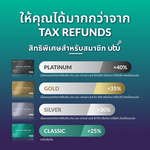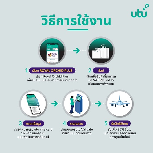 ง่าย ๆ เพียงดาวน์โหลดและลงทะเบียนผ่านแอป utu Tax Free เพื่อรับบัตร utu visa (Virtual Card) พร้อมเพลิดเพลินกับไมล์สะสมเพิ่มเติม 25% จากการขอคืนภาษีมูลค่าเพิ่ม และสำหรับสมาชิกระดับพรีเมียมที่ทำการสะสมเครดิตภาษีเงินคืนหรือชําระเงินค่าสมาชิก utu จะได้รับการคืนภาษีมูลค่าเพิ่มมากขึ้นถึง 40% ทั้งนี้ ปัจจุบัน utu ได้ร่วมมือกับพันธมิตรสายการบินและโรงแรมระดับโลก 13 แห่ง ซึ่ง รอยัล ออร์คิด พลัส เป็นรายแรกที่เปิดตัวการปรับเทียบสถานภาพบัตร ที่ให้สมาชิกรอยัล ออร์คิด พลัส ได้รับการเลื่อนอันดับเป็นสมาชิกระดับพรีเมียมของ utu โดยอัตโนมัติ