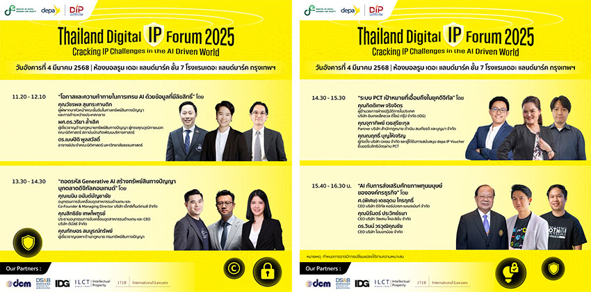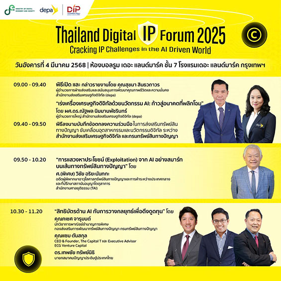 นอกจากนี้ ผู้ร่วมงานจะได้รับสาระความรู้ผ่านการบรรยายพิเศษในหัวข้อ เร่งเครื่องเศรษฐกิจดิจิทัลด้วยนวัตกรรม AI: ก้าวสู่อนาคตที่พลิกโฉม โดย ผศ.ดร.ณัฐพล นิมมานพัชรินทร์ ผู้อำนวยการใหญ่ ดีป้า และร่วมเป็นส่วนหนึ่งของพิธีลงนามบันทึกข้อตกลงความร่วมมือการส่งเสริมทรัพย์สินทางปัญญาขับเคลื่อนอุตสาหกรรมและนวัตกรรมดิจิทัล ระหว่าง ดีป้า และ กรมทรัพย์สินทางปัญญา รวมถึงการเสวนาเชิงลึกจากผู้เชี่ยวชาญด้านทรัพย์สินทางปัญญาระดับแนวหน้าของไทย นำโดย ศ.(พิเศษ) วิชัย อริยะนันทกะ อดีตผู้พิพากษาอาวุโสศาลทรัพย์สินทางปัญญาและการค้าระหว่างประเทศกลาง และที่ปรึกษาสถาบันอนุญาโตตุลาการ สำนักงานศาลยุติธรรม (TAI) โดยมีหัวข้อที่น่าสนใจ ได้แก่ การแสวงหาประโยชน์ (Exploitation) จาก AI อย่างสมาร์ทบนเส้นทางทรัพย์สินทางปัญญา สิทธิบัตรด้าน AI กับการวางกลยุทธ์เพื่อดึงดูดทุน โอกาสและความท้าทายในการเทรน AI ด้วยข้อมูลที่มีลิขสิทธิ์ ถอดรหัส Generative AI สร้างทรัพย์สินทางปัญญาบุกตลาดดิจิทัลคอนเทนต์ ระบบ PCT เป้าหมายที่เอื้อมถึงในยุคดิจิทัล และ AI กับการส่งเสริมศักยภาพทุนมนุษย์ขององค์กรธุรกิจ