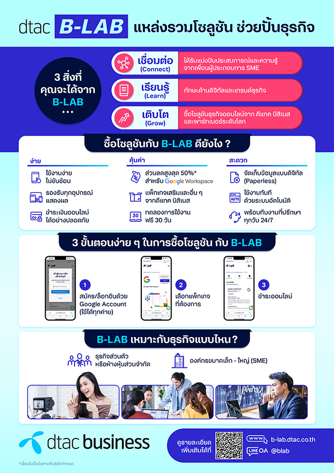 สามารถสมัครออนไลน์และใช้งานได้ทันที สนใจดูรายละเอียดเพิ่มเติม B-LAB ได้ที่ https://b-lab.dtac.co.th/