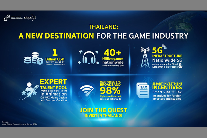 ผศ.ดร.ณัฐพล นิมมานพัชรินทร์ ผู้อำนวยการใหญ่ ดีป้า เปิดเผยว่า อุตสาหกรรมเกมของไทยมีมูลค่าสูงถึง 35,000 ล้านบาท และมีอัตราการเติบโตอย่างต่อเนื่อง ซึ่งแสดงให้เห็นถึงความสำคัญของอุตสาหกรรมนี้ต่อเศรษฐกิจของประเทศ โดยภาครัฐได้เดินหน้าพัฒนาและผลักดันร่างพระราชบัญญัติ (พ.ร.บ.) ส่งเสริมอุตสาหกรรมเกม เพื่อส่งเสริมและยกระดับอุตสาหกรรมเกมไทยอย่างเป็นระบบ ทั้งในด้านการลงทุน การคุ้มครองทรัพย์สินทางปัญญา และการพัฒนาบุคลากรด้านดิจิทัล เพื่อสร้างความมั่นใจแก่ผู้ประกอบการและนักลงทุน ทั้งในและต่างประเทศ อีกทั้งประเทศไทยมีบุคลากรคุณภาพสูงที่เชี่ยวชาญด้าน Animation, Computer Graphics, Game Studio, Visual Effect และ Digital Content จำนวนเพียงพอต่อความต้องการของตลาดโลก นอกจากนี้ยังมีสตูดิโอและนักพัฒนาเกมที่มีประสบการณ์พร้อมรองรับโครงการขนาดใหญ่จากต่างประเทศ