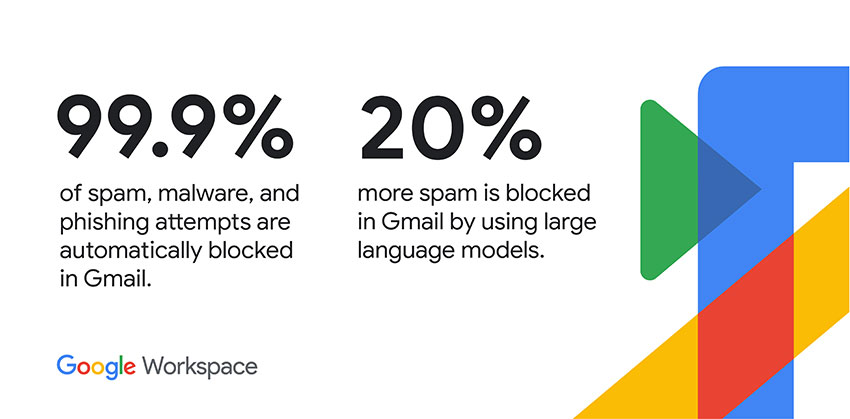 ความเป็นส่วนตัวและความปลอดภัยของข้อมูลยังคงเป็นสิ่งสำคัญที่สุดในยุคของ Generative AI ซึ่งในปีที่แล้วพบว่ามีการละเมิดข้อมูลเพิ่มขึ้น 20% ดังนั้นเพื่อให้เกิดความแตกต่างจากโซลูชันอีเมลและประสิทธิภาพการทำงานแบบเดิม ๆ Gmail และ Workspace จึงถูกสร้างขึ้นบนสถาปัตยกรรมบนระบบคลาวด์ตั้งแต่เริ่มต้น โดยมีรากฐานมาจากหลักการ Zero-trust และเสริมด้วยการป้องกันภัยคุกคามที่ขับเคลื่อนด้วย AI ทำให้ Gmail สามารถบล็อกสแปม การฟิชชิ่งข้อมูล และมัลแวร์ไม่ให้เข้าถึงกล่องจดหมายของคุณได้มากกว่า 99.9% และตอนนี้เมื่อใช้โมเดลแบบ LLM (Large Language Models) ที่เป็นโมเดลภาษาขนาดใหญ่ เราจำสามารถบล็อกสแปมใน Gmail ได้เพิ่มขึ้นอีก 20% และสามารถประเมินสแปมที่ผู้ใช้รายงานใน Gmail ได้มากขึ้น 1,000 เท่าทุกวัน