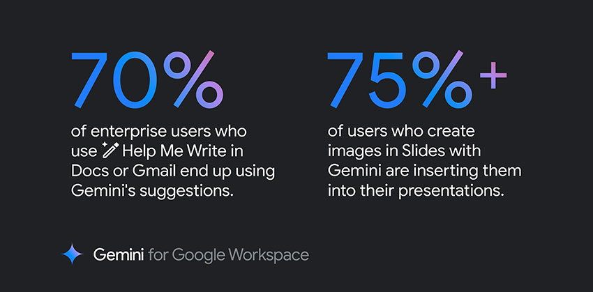 ในปีที่ผ่านมา เราได้เปิดตัวฟีเจอร์และการเพิ่มประสิทธิภาพหลายร้อยรายการใน Google Workspace และ Gemini for Workspace (Gemini สำหรับ Workspace) และเราเห็นว่าสิ่งเหล่านี้มีผลกระทบต่อลูกค้าของเราอย่างแท้จริง ซึ่ง 70% ของผู้ใช้ระดับองค์กรที่ได้ป้อนคำสั่ง ช่วยฉันเขียน ใน Docs หรือ Gmail ลงเอยด้วยการใช้คำแนะนำของ Gemini และมีผู้ใช้มากกว่า 75% ที่สร้างรูปภาพใน Slides ได้ใช้รูปภาพจาก AI ในการนำเสนอของตน