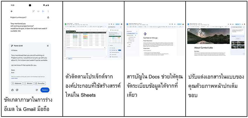 - การป้อนคำสั่งด้วยเสียงและขัดเกลาทันทีใน Gmail: ส่งอีเมลได้ง่ายขึ้นด้วยการป้อนข้อมูลด้วยเสียงใน "ช่วยฉันเขียน (Help me write)" และแปลงบันทึกย่อให้เป็นอีเมลฉบับสมบูรณ์ได้ในคลิกเดียว