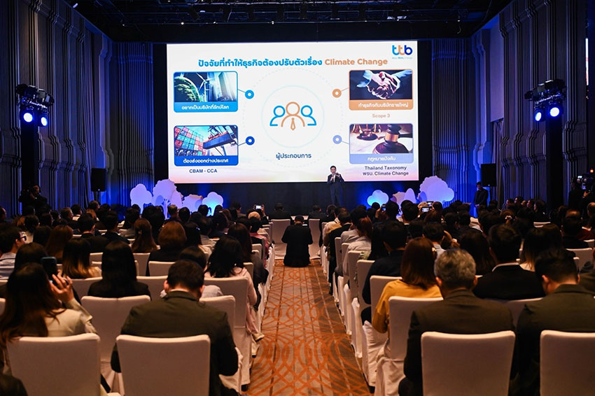 นายศรัณย์ ภู่พัฒน์ ประธานเจ้าหน้าที่บริหารลูกค้าธุรกิจ ทีเอ็มบีธนชาต กล่าวว่า การเปลี่ยนแปลงสภาพภูมิอากาศ หรือ Climate Change เป็นหัวข้อที่ทั่วโลกกำลังให้ความสำคัญ เพื่อหลีกเลี่ยงผลกระทบที่อาจจะเกิดขึ้นอย่างรุนแรงกับโลกของเรา ซึ่งปัจจุบันมีการปล่อยก๊าซเรือนกระจกเกือบ 4 หมื่นล้านตันต่อปี ทำให้มีมาตรการ Carbon Border Adjustment Mechanism (CBAM) ที่นำมาบังคับใช้กับบริษัทผู้ส่งออกไปยังสหภาพยุโรป รวมไปถึงนโยบายเรื่องความยั่งยืนของประเทศไทยจากภาครัฐ ได้แก่ พ.ร.บ.การเปลี่ยนแปลงสภาพภูมิอากาศ หรือ พ.ร.บ. Climate Change ที่จะมีผลบังคับใช้ในอนาคต ดังนั้นผู้ประกอบการไทยจึงต้องเร่งหันมาปรับตัวและเปลี่ยนผ่านธุรกิจ หรือ Business Green Transition นำพาองค์กรก้าวสู่ธุรกิจสีเขียว ซึ่งหากสามารถจัดการธุรกิจในเรื่องดังกล่าวได้ดี จะยิ่งเป็นการสร้างโอกาสในการต่อยอดให้กับธุรกิจได้เติบโต ไม่ว่าจะเป็นการลดต้นทุน ลดการใช้พลังงาน สร้างภาพลักษณ์ที่ดีต่อองค์กร นำไปสู่การเพิ่มยอดขายในที่สุด