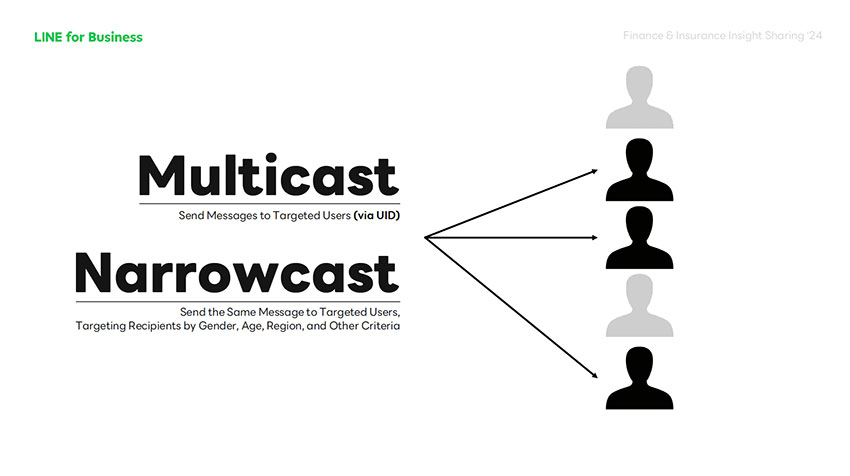 หลากหลายแบรนด์มีการเชื่อมต่อ LINE OA กับระบบต่างๆ ที่ตนเองมีอยู่ผ่าน LINE API นอกจากเพื่อเสริมสร้าง ต่อยอดประสบการณ์การใช้งานของลูกค้าใน LINE OA ให้ครบครัน ครอบคลุมและหลากหลายแล้ว ยังช่วยให้แบรนด์ได้รับข้อมูลส่วนตัวจากลูกค้าโดยตรง ด้วยเงื่อนไขที่ลูกค้าจำเป็นต้องผูกบัญชีและ Verify ตัวตนเบื้องต้นก่อนใช้งาน โดยแบรนด์สามารถนำข้อมูลดังกล่าว รวมถึง User ID ของลูกค้าที่ได้ มาร่วมจำแนก จัดเป็นกลุ่มเป้าหมายที่แตกต่างกันไป เพื่อเลือกสื่อสาร นำเสนอคอนเทนต์ และบริการแบบ Personalized ให้ลูกค้าแต่ละคน แต่ละกลุ่ม ได้ตรงใจ ในหลากหลายรูปแบบ ไม่ว่าจะเป็น การบรอดแคสต์ข้อความแบบ Narrowcast ตามกลุ่มลักษณะของลูกค้าที่แบรนด์ได้แบ่งกลุ่มไว้ การบรอดแคสต์ข้อความแบบ Multicast ถึงลูกค้ากลุ่มใหญ่โดยอาศัยข้อมูล User ID ที่แบรนด์ได้มา รวมไปถึงการส่งข้อความแชต 1:1 หาลูกค้าเป้าหมายรายบุคคล เป็นต้น ซึ่งการส่งข้อความแบบ Personalized เช่นนี้ ย่อมทำให้ประสบการณ์ของลูกค้าเป็นที่น่าประทับใจ ลูกค้าได้รับข้อมูลตรงความสนใจ ลดอัตราการบล็อค LINE OA ไปด้วยในตัว จึงกลายเป็นที่นิยมของหลากหลายแบรนด์ในกลุ่มธุรกิจนี้ ด้วยอัตราการบรอดแคสต์ข้อความแบบ Narrowcast และ Multicast ในปี 2024 เติบโตจากปีที่ผ่านมาถึง 2 เท่า
