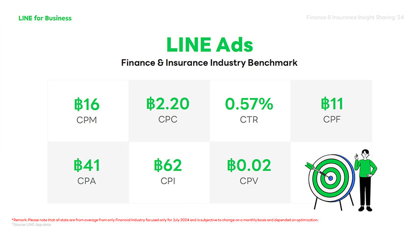 ผลลัพธ์และประสิทธิภาพของเครื่องมือดิจิทัลที่วัดผลได้ชัดเจน เป็นสิ่งที่กลุ่มธุรกิจการเงินและประกันให้ความสำคัญ โดยกลุ่มธุรกิจนี้ นับเป็นกลุ่มธุรกิจที่ลงทุนในโฆษณาผ่าน LINE Ads มากที่สุดในช่วง 4 เดือนที่ผ่านมา สะท้อนให้เห็นถึงความคุ้มค่าในเม็ดเงินลงทุน โดยวัตถุประสงค์ 3 อันดับแรกของการใช้งาน LINE Ads สำหรับกลุ่มธุรกิจนี้ คือ Website Conversion 45% การเข้าชมเว็บไซต์หรือ Website Visit 30% และ Smart Channel Custom 11% พร้อมค่าเฉลี่ยผลลัพธ์การใช้งาน LINE Ads อันโดดเด่นจากกลุ่มธุรกิจนี้ (ณ เดือนก.ค. 2567) อาทิ ต้นทุนต่อการแสดงผลพันครั้งหรือ CPM 16 บาท ต้นทุนต่อการคลิกหรือ CPC 2.20 บาท อัตราการคลิกต่อจำนวนการมองเห็นหรือ CTR 0.57% เป็นต้น เมื่อมีมาตรฐานการชี้วัดผลลัพธ์ที่ชัดเจน LINE Ads จึงถือเป็นอีกหนึ่งเทรนด์การใช้งานดิจิทัลบน LINE ที่ได้รับความนิยมจากกลุ่มธุรกิจนี้เช่นกัน
