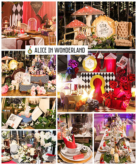 อีกหนึ่งธีมที่เป็นตัวเลือกอันดับแรกๆ สำหรับปาร์ตี้ที่ต้องการความแฟนตาซี โดย Alice in Wonderland เป็นวรรณกรรมที่แต่งโดยนักเขียนชาวอังกฤษ และออกตีพิมพ์ครั้งแรกตั้งแต่ช่วงปี 1500 ซึ่งเป็นเรื่องราวเกี่ยวกับเด็กผู้หญิงคนหนึ่งที่ต้องการหลุดพ้นจากโลกที่เต็มไปด้วยกฎเกณฑ์และบีบบังคับ รวมถึงโลกที่ผู้หญิงยังมีอิสระน้อย เรื่องนี้ได้รับแรงบันดาลใจจากการเล่านิทานเพื่อแก้เบื่อหรือหลีกหนีความธรรมดาของธรรมชาติรอบตัว จนกระทั่งเรื่องราวนี้ได้รวมเล่มเป็นหนังสือที่มีภาพวาดแสดงถึงเรื่องราวและอารมณ์ได้อย่างชัดเจน