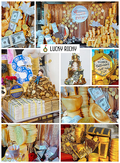 การพูดถึงเรื่องความร่ำรวยเป็นเรื่องมงคลที่หลายคนอยากพูดถึง นอกจากนี้ยังสามารถซ่อนความเหนือจินตนาการอยู่ด้วย โดยที่ธีมนี้เป็นความเหนือจินตนาการที่เข้าใจง่ายที่สุด เพราะทุกคนก็เข้าใจว่าของที่จะทำให้รู้สึกว่าเป็นเศรษฐีนั้นจะต้องมีอะไรบ้าง แต่อีกนัยหนึ่งการจัดงานในเรื่องของความร่ำรวยก็เพราะต้องการส่งผ่านความเฮง หรือว่าโชคดีให้เกิดแก่เจ้าภาพหรือบริษัทนั้น ๆ เป็นการสร้างเป้าหมาย สร้างกำลังใจให้เห็นว่า จากวันนี้เป็นต้นไปเราจะต้องร่ำรวยสักวัน องค์ประกอบรูปธรรมของความร่ำรวยนั้นก็ประกอบไปด้วยวัตถุธาตุที่หลากหลาย ไม่ว่าจะเป็นทอง เงิน เพชร พลอย ซึ่งจะมีสีสันหรือโทนที่แตกต่างกัน ซึ่งสามารถจัดงานในธีมความร่ำรวยได้ในหลายรูปแบบ