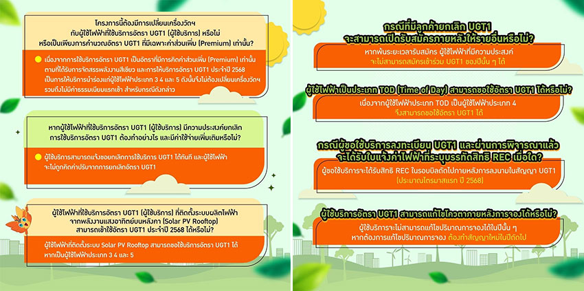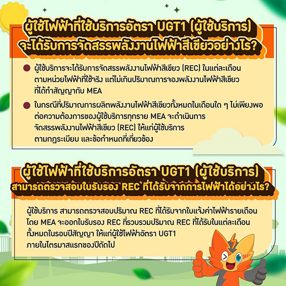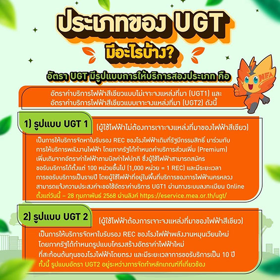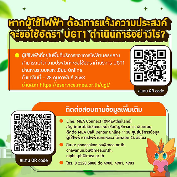 ทั้งนี้ผู้ใช้ไฟฟ้าที่ประสงค์จะขอใช้บริการอัตรา UGT1 และอยู่ในพื้นที่ให้บริการของ MEA (กรุงเทพมหานคร นนทบุรี และสมุทรปราการ) สามารถดาวน์โหลดเอกสารประกอบการลงทะเบียน และดำเนินการลงทะเบียนได้ ตั้งแต่วันนี้ - 28 กุมภาพันธ์ 2568 ผ่านลิงก์ https://eservice.mea.or.th/ugt/