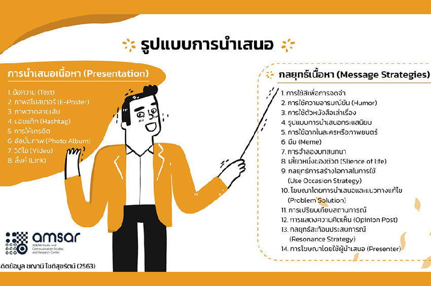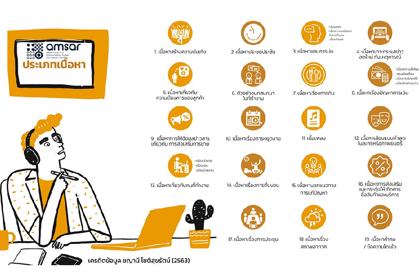 ศูนย์ศึกษาสื่อและการสื่อสารอาเซียน (AMSAR) ร่วมกับหลักสูตรปริญญาโท สาขาวิชานิเทศศาสตร์การตลาด ม.หอการค้าไทย เปิดเผยผลวิจัยของ นางสาวชญานี โชติสุขรัตน์ ในเรื่อง “การวิเคราะห์รูปแบบการนำเสนอเนื้อหาเพจสะท้อนชีวิตคนทำงานออฟฟิศ”โดยงานศึกษาวิจัยนี้วิเคราะห์เนื้อหา (Content Analysis) เพื่อศึกษารูปแบบและเนื้อหาบนเพจที่สะท้อนชีวิตคนทำงานออฟฟิศที่ได้รับความนิยมรวม 3 เพจ ได้แก่ เพจบรีฟเหี้ย เพจกว่าจะถึงออฟฟิศ และเพจชีวิตเอเจนซี่ ผู้ศึกษาได้ทำการวิเคราะห์เนื้อหาบนโพสต์เฟซบุ๊กชีวิตคนทำงานออฟฟิศรวม 153 โพสต์โดยศึกษาเนื้อหาทุกบทความที่โพสต์ระหว่างวันที่ 26 มีนาคม – 14 มิถุนายน 2563 เป็นเวลา 3 เดือน ศึกษา เนื่องจากเป็นช่วงเวลาที่มีข้อกำหนดพระราชกำหนดฉุกเฉิน (พ.ร.ก.ฉุกเฉิน) ฉบับที่ 1 เพื่อควบคุมการแพร่ระบาดของโรคโควิด-19 และองค์กรโดยส่วนใหญ่ประกาศให้พนักงานออฟฟิศทำงานที่บ้าน (Work From Home) หรือบางบริษัทมีการจำกัดเวลาการทำงานเป็นการปรับสถานการณ์ให้เข้ากับพรก.ฉุกเฉินฉบับที่ 1 ด้วยเวลาที่จำกัด ซึ่งเนื้อหาแต่ละโพสต์มียอดไลก์อยู่ที่ 2,6,9 – 11,217 ไลก์ ยอดแชร์ 50 – 8,000 แชร์ และยอดคอมเมนต์อยู่ที่ 50 ไปจนถึง 100 คอมเมนต์