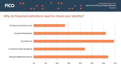 ผู้ตอบแบบสอบถามมากกว่า 2 ใน 3 (69%) เข้าใจดีว่า กระบวนการตรวจสอบอัตลักษณ์บุคคลมีขึ้นเพื่อปกป้องข้อมูลของพวกเขา อย่างไรก็ตาม ผู้บริโภคชาวไทยบางคนมองเหตุผลในการยืนยันตัวตนในแง่ลบ ขณะที่ผู้บริโภคจำนวนมาก (64%) รับทราบว่า มีหลายองค์ประกอบของข้อบังคับต่างๆ ที่ผลักดันให้ผู้ให้บริการต้องเพิ่มการตรวจสอบมากขึ้น ขณะที่ 27% มองว่าการตรวจสอบดังกล่าวเป็นการเปิดทางให้สถาบันการเงินสามารถขายผลิตภัณฑ์ได้มากขึ้น