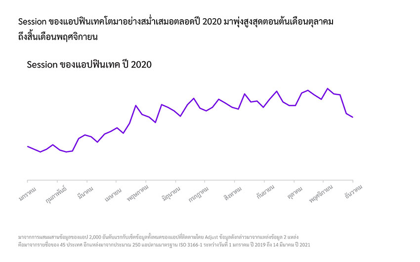 ปีที่ผ่านมา แอปฟินเทคเติบโตอย่างพุ่งทะยาน เหตุจากล็อกดาวน์ทำให้ผู้คนไม่สามารถออกไปธนาคารได้ จึงมองหาทางเลือกใหม่ ขณะที่กลุ่มผู้ค้าปลีกเองก็มองหาทางเลือกการชำระเงินรูปแบบใหม่ เช่น ระบบชำระเงินไร้สัมผัสด้วย ส่งผลให้ปี 2020 เป็นปีทองของแอปฟินเทค ขณะที่ธุรกิจประเภทอื่นๆ ก็มีการใช้งานเพิ่มขึ้นด้วยเช่นกัน จากรายงาน Mobile App Trends Report ปี 2021 ของ Adjust ระบุว่าแอปฟินเทคมีการเติบโตมากที่สุดถึง 51% เมื่อทียบปีต่อปี และขยายตัวเพิ่มขึ้นอีก 12% ในช่วงต้นปี 2021