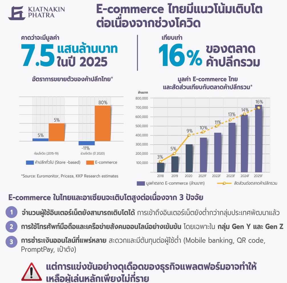 เพิ่มขึ้นจากระดับ 3 แสนล้านบาทในปัจจุบัน เป็น 7.5 แสนล้านบาทในปี 2025 หรือคิดเป็น 16% ของตลาดค้าปลีกรวม ซึ่งเฉพาะในปี 2020 ที่ผ่านมา E-commerce ไทยขยายตัวอย่างก้าวกระโดดถึง 80% สะท้อนการเปลี่ยนพฤติกรรมการซื้อสินค้าของผู้บริโภคไปสู่ช่องทางออนไลน์เพิ่มมากขึ้น จากข้อจำกัดด้านการเดินทางจากมาตรการล็อกดาวน์ โดยสินค้าอิเล็กทรอนิกส์และหมวดอาหารและสุขภาพมีแนวโน้มขยายตัวดี ขณะที่การใช้จ่ายด้านการจองโรงแรมและการเดินทางหดตัวอย่างรุนแรง