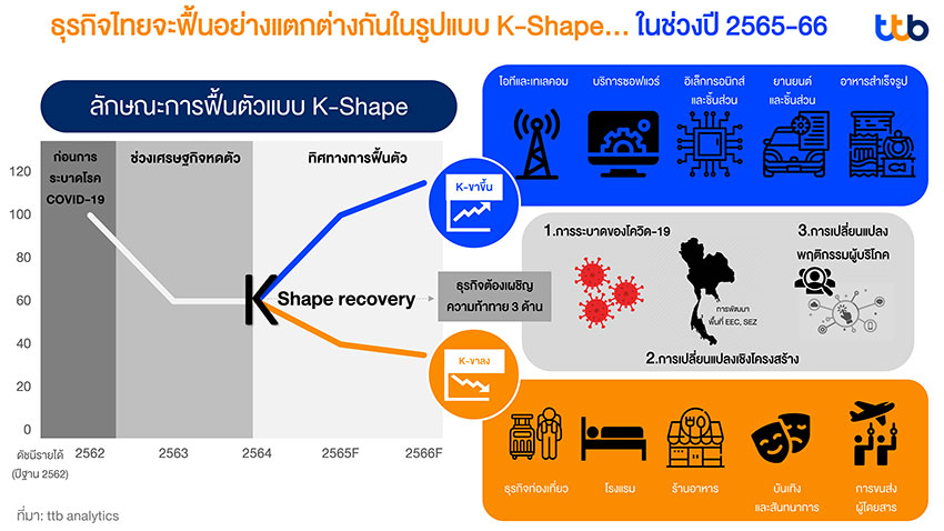 ด้วย 3 ปัจจัยท้าทายที่ภาคธุรกิจจะต้องเผชิญ ttb analytics ประเมินว่า จะส่งผลทำให้การฟื้นตัวของแต่ธุรกิจในระยะปานกลางแตกต่างกัน กล่าวคือ มีธุรกิจที่ฟื้นและเติบโตดี และธุรกิจที่ไม่ฟื้นและตกต่ำต่อเนื่องจนกว่าโรคโควิด-19 จะหมดไป หรืออยู่ในรูปแบบการฟื้นตัวแบบ K-Shape ดังนี้