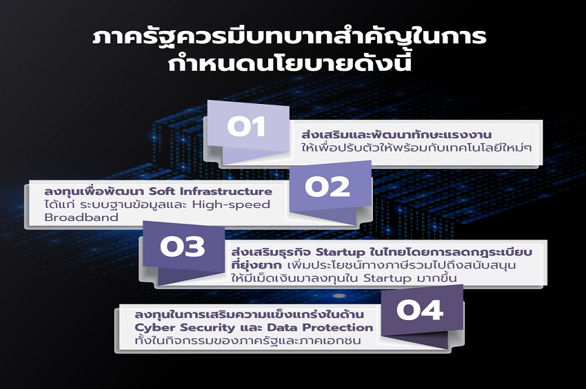 นอกจากนี้ การที่จะลดผลกระทบต่อเศรษฐกิจไทยจากความเสี่ยงที่อาจเกิดขึ้นรวมไปถึงการรักษาตำแหน่งในห่วงโซ่อุปทานโลกในอนาคต ทุกฝ่ายที่เกี่ยวข้องควรมีการติดตามสถานการณ์ความขัดแย้งทางด้านเทคโนโลยีอย่างใกล้ชิด โดยภาครัฐควรมีบทบาทสำคัญในการกำหนดนโยบายดังนี้ 1) ส่งเสริมและพัฒนาทักษะแรงงานให้เพื่อปรับตัวให้พร้อมกับเทคโนโลยีใหม่ๆ 2) ลงทุนเพื่อพัฒนา soft infrastructure ได้แก่ ระบบฐานข้อมูล และ High-speed broadband 3) ลดกฎระเบียบที่ยุ่งยากและเพิ่มความชัดเจนของนโยบายทางภาษีและนโยบายส่งเสริมการลงทุน และส่งเสริมธุรกิจสตาร์ทอัพในไทย 4) ลงทุนในการเสริมความแข็งแกร่งในด้าน Cyber security และ data protection ทั้งในกิจกรรมของภาครัฐและภาคเอกชน โดยนโยบายที่มีประสิทธิภาพจะทำให้ไทยสามารถพลิกจากความเสี่ยงที่มีผลกระทบขนาดใหญ่กลายเป็นโอกาสในการเป็นส่วนหนึ่งของห่วงโซอุปทานแห่งอนาคตและเพิ่มผลิตภาพให้กับเศรษฐกิจไทย