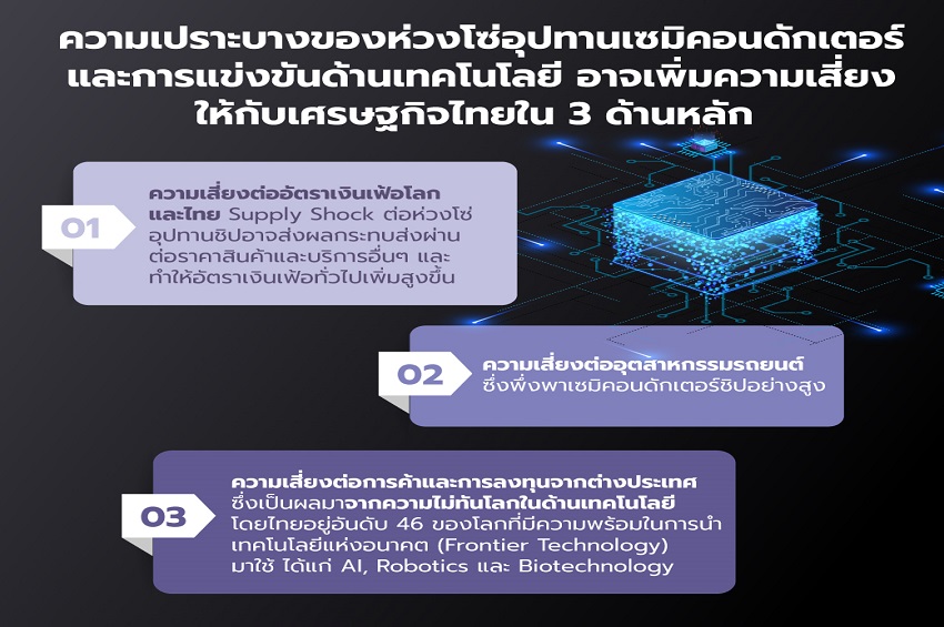 KKP Research มองว่าการแข่งขันด้านเทคโนโลยีระหว่างสหรัฐฯกับจีนรวมไปถึงความเปราะบางของห่วงโซ่อุปทานเซมิคอนดักเตอร์ อาจเพิ่มความเสี่ยงให้กับเศรษฐกิจไทยใน 3 ด้านหลัก ได้แก่