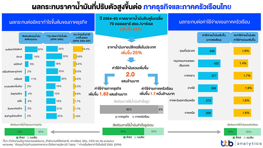 จากการวิเคราะห์ผลกระทบราคาน้ำมันสำเร็จรูปในประเทศที่สูงขึ้นต่อภาคธุรกิจและภาคครัวเรือนผ่านโครงสร้างการ.ใช้น้ำมันสำเร็จรูปของประเทศไทย จะพบว่า ในแต่ละปีมีการใช้น้ำมันสำเร็จรูปอยู่ระหว่าง 3.4 – 3.6 หมื่นล้านลิตรต่อปี แบ่งเป็นการใช้กลุ่มน้ำมันดีเซล 68% ที่เหลือเป็นการใช้กลุ่มน้ำมันเบนซิน 32% โดยภาคธุรกิจมีการใช้น้ำมันสำเร็จรูปมากเป็นสัดส่วนสูงถึง 92% ในขณะที่ภาคครัวเรือนใช้น้ำมันสำเร็จรูปเพียง 8% ของการใช้รวมทั้งประเทศ ซึ่งระดับราคาน้ำมันสำเร็จรูปที่คาดว่าจะเพิ่มขึ้น 25% ในปี 2564-2565 จะทำให้ค่าใช้จ่ายด้านน้ำมันเพิ่มสูงขึ้น 2 แสนล้านบาท (คำนวณเทียบบนฐานปริมาณการใช้น้ำมันในปีปกติ) คิดเป็น 1.3% ต่อจีดีพี โดยจะทำให้ต้นทุนภาคธุรกิจสูงขึ้น 1.83 แสนล้านบาท และค่าใช้จ่ายด้านน้ำมันของภาคครัวเรือนเพิ่มสูงขึ้น 1.7 หมื่นล้านบาท