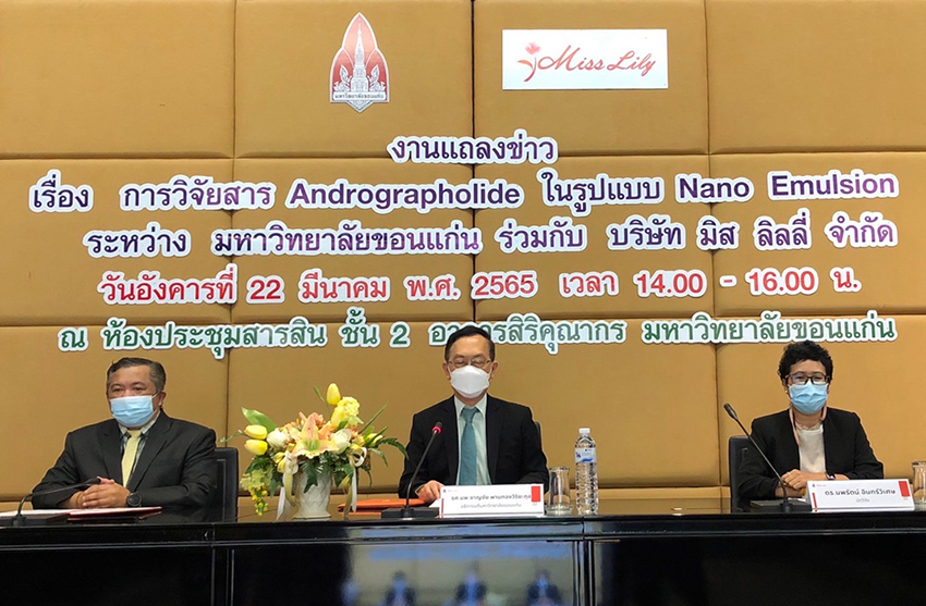 รศ.นพ.ชาญชัย พานทองวิริยะกุล อธิการบดีมหาวิทยาลัยขอนแก่น กล่าวว่า “การแพร่ระบาดของโรคโควิด ทำให้ชื่อของสมุนไพรฟ้าทะลายโจรกลายเป็นความหวังในการบรรเทาอาการของผู้ป่วย เพราะมีสรรพคุณที่ป้องกัน รักษาอาการหวัด และยับยั้งการเพิ่มจำนวนของไวรัส โดยสารสำคัญในฟ้าทะลายโจรที่ให้ฤทธิ์ป้องกันและยับยั้งเชื้อโควิดได้ก็คือ ‘แอนโดรกราโฟไลด์’ (Andrographolide) ซึ่งทุกวันนี้ สารนี้ได้รับความสนใจในระดับสากล มีการนำมาพัฒนามากยิ่งขึ้นด้วยเทคโนโลยีทางการแพทย์ และมีงานวิจัยข้อมูลทางการแพทย์มากมายในต่างประเทศ มหาวิทยาลัยขอนแก่นเอง โดยฝ่ายวิจัยและบัณฑิตศึกษาก็ได้ทำการศึกษาวิจัยเกี่ยวกับสารดังกล่าวมาโดยตลอด จนล่าสุดประสบความสำเร็จในการคิดค้นแนวทางการนำสารแอนโดรกราโฟไลด์มาใช้ให้เกิดประโยชน์กับร่างกายได้อย่างมีประสิทธิภาพ โดยอยู่ในรูปแบบนาโนอิมัลชัน (nano-emulsion)”