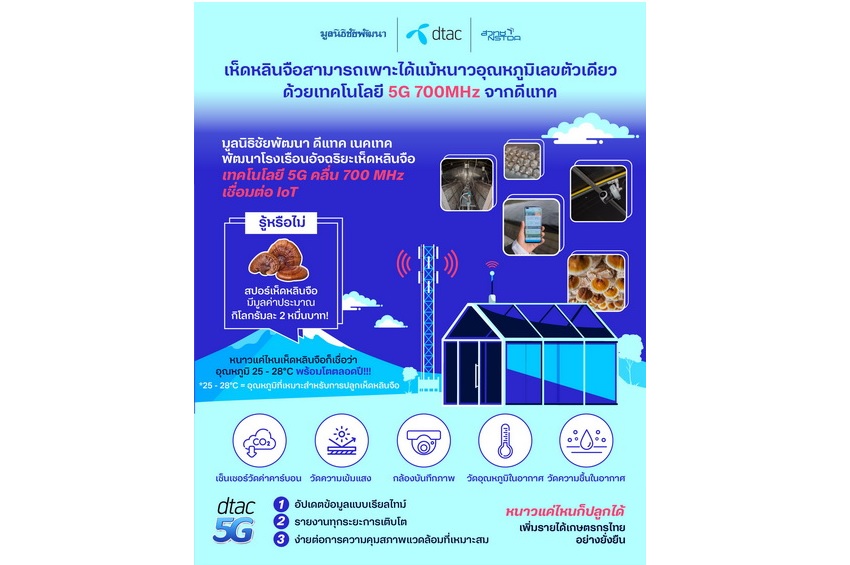 ดีแทค ร่วมกับมูลนิธิชัยพัฒนา และเนคเทค สวทช. คิดค้นโครงการวิจัยโรงเรือนเกษตรอัจฉริยะกรณีศึกษาเห็ดหลินจือ นำเทคโนโลยี 5G คลื่น 700 MHz พร้อม IoT และ Machine Leaning ตอบโจทย์เพาะเห็ดหลินจือในฤดูหนาวเลขตัวเดียวสำเร็จ พร้อมนำองค์ความรู้มาพัฒนาการทำเกษตรแม่นยำ เก็บดาต้าปัจจัยแวดล้อม ลดการปนเปื้อนของเชื้อโรค สู่การควบคุมโรงเรือน ตั้งทุกค่า คำนวณเหมาะสมสภาพแวดล้อมเพาะปลูก ดึงธนาคารทรัพยากรชีวภาพแห่งชาติร่วมทดสอบและวิจัย เตรียมเผยแพร่องค์ความรู้ต่อเกษตรกรในพื้นที่หนาวเย็น ยกระดับคุณภาพชีวิตและสร้างรายได้อย่างยั่งยืน