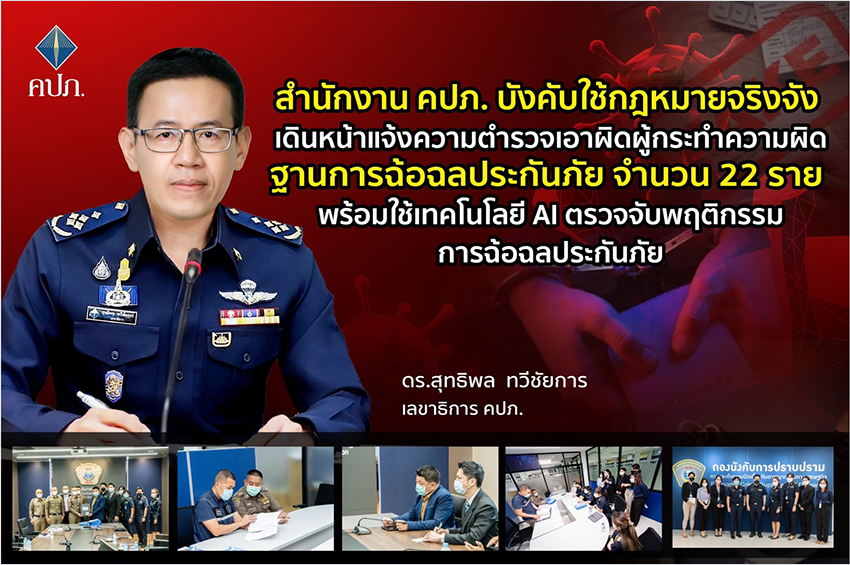 เลขาธิการ คปภ. กล่าวด้วยว่า การดำเนินคดีกับผู้กระทำความผิดด้านประกันภัยในครั้งนี้นับเป็นครั้งแรกนับตั้งแต่กฎหมายตามพระราชบัญญัติประกันชีวิตและพระราชบัญญัติประกันวินาศภัย (ฉบับที่ 4) พ.ศ. 2562 มีผลใช้บังคับเมื่อวันที่ 21 พฤศจิกายน 2562 โดยกฎหมายดังกล่าวได้บัญญัติเรื่องเกี่ยวกับการฉ้อฉลประกันภัยไว้ 3 กรณี ได้แก่ กรณีแรก มีการหลอกลวงให้ผู้อื่นทำประกันภัย กรณีที่ 2 เรียกร้องค่าสินไหมทดแทนอันเป็นเท็จ และกรณีที่ 3 ให้เรียกรับ ทรัพย์สิน เพื่อให้ชดใช้ค่าสินไหมทดแทน ซึ่งในการปฏิบัติตามบทบัญญัตินี้สำนักงาน คปภ. ได้ออกระเบียบสำนักงาน คปภ. ว่าด้วยการรับและพิจารณาเรื่องร้องเรียนเกี่ยวกับการฝ่าฝืนหรือไม่ปฏิบัติตามกฎหมายเกี่ยวกับการประกันภัย พ.ศ. 2564 และได้ตั้งคณะกรรมการพิจารณากลั่นกรองคดีฉ้อฉลประกันภัย ซึ่งมีผู้บริหารของสำนักงาน คปภ. ผู้บัญชาการตำรวจสอบสวนกลางหรือผู้แทนและผู้ทรงคุณวุฒิอีก 4 คน ซึ่งเลขาธิการแต่งตั้งจากผู้มีความเชี่ยวชาญด้านกฎหมาย คดี นิติวิทยาศาสตร์ หรือการฉ้อฉลประกันภัย เป็นกรรมการ โดยมีอำนาจในการพิจารณาว่าการกระทำใดเป็นความผิดฐานฉ้อฉลประกันภัยหรือไม่ ซึ่งเมื่อมีมติให้ดำเนินคดีกับผู้กระทำความผิดแล้ว ก็จะเสนอต่อเลขาธิการ คปภ. เพื่อให้ความเห็นชอบ ก่อนดำเนินคดีร้องทุกข์กล่าวโทษต่อไป