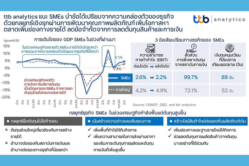 ทั้งนี้ ข้อเสียดังกล่าวข้างต้นเป็นข้อเสียเปรียบทางธรรมชาติของธุรกิจ SMEs ที่การบริหารจัดการเรื่องต้นทุนไม่อาจแก้ปัญหาได้ทั้งหมด จึงเป็นเรื่องที่ธุรกิจ SMEs ต้องยอมรับว่า การจัดการเรื่องต้นทุนไม่ใช่กลยุทธ์ที่เหมาะสม จากสัญญาณบ่งชี้ของภาพรวมธุรกิจในยามที่เศรษฐกิจหดตัว ด้วยเหตุนี้ ttb analytics แนะธุรกิจ SMEs ควรเน้นการตลาดเชิงรุก เนื่องจากเศรษฐกิจกำลังเข้าสู่ภาวะฟื้นตัว จากภาคการท่องเที่ยวภายในประเทศที่กลับมาเกือบสมบูรณ์ และจำนวนนักท่องเที่ยวต่างชาติที่ยังคงเพิ่มสูงต่อเนื่อง รวมถึงการบริโภคที่ยังทรงตัวและมีแนวโน้มไปทางดี ปัจจัยบวกเหล่านี้เป็นสัญญาณที่ดีของธุรกิจ SMEs ที่ควรเริ่มเร่งทำการตลาด ด้วยการมุ่งเน้นการสร้างเอกลักษณ์และมูลค่าเพิ่มให้กับผลิตภัณฑ์ โดยอาศัยความได้เปรียบเรื่องขนาดกิจการที่กระทัดรัด และการปรับเปลี่ยนกลยุทธ์ที่เร็วเพื่อตอบโจทย์ผู้คนได้ง่ายกว่าธุรกิจรายใหญ่ รวมถึงการสร้างไลน์สินค้าหรือบริการใหม่ ๆ ที่เกี่ยวเนื่องกับผลิตภัณฑ์เดิมให้ครอบคลุมความต้องการของผู้คนเพิ่มขึ้น เพื่อเป็นช่องทางรายได้ใหม่ และสร้างพื้นที่กำไรให้สูงขึ้น เมื่อธุรกิจมีกำไรเพิ่มขึ้นจะช่วยลดอัตราการพึ่งพาสินเชื่อจากสถาบันการเงินที่มีต้นทุนดอกเบี้ย รวมถึงการสร้างเอกลักษณ์และพัฒนาคุณภาพผลิตภัณฑ์ จะช่วยเพิ่มอำนาจต่อรองกับผู้ซื้อ และเพิ่มความสามารถในการส่งผ่านราคาสินค้าเพื่อรองรับต้นทุนที่เพิ่มขึ้นได้ดี ซึ่งเป็นการลดภาระต้นทุนทางการเงินของกิจการไม่ให้แบกภาระมากเกินไปเช่นในปัจจุบัน ขณะเดียวกัน เมื่อพื้นที่กำไรและฐานรายได้เพิ่มขึ้นย่อมเพิ่มอำนาจต่อรองกับสถาบันการเงินที่อาจช่วยลดต้นทุนทางการเงิน รวมทั้งอำนาจต่อรองทางธุรกิจที่ช่วยลดจำนวนเงินทุนหมุนเวียนที่ต้องสำรองไว้ซึ่งถือเป็นภาระทางการเงินสำคัญประการหนึ่งของธุรกิจ