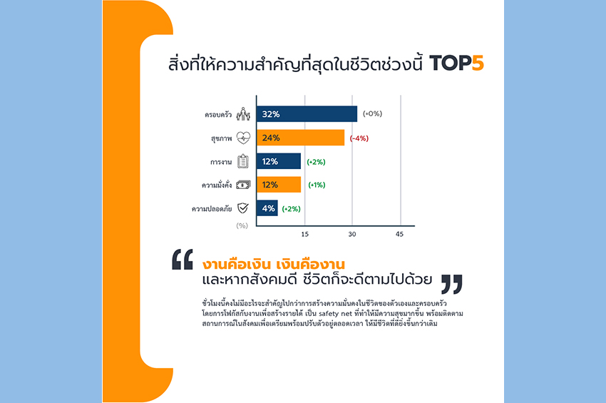 ในสถานการณ์ที่ข้าวยากหมากแพง ผู้คนก็ยังคงต้องซื้อของกินของใช้ มีรายจ่ายเพิ่มขึ้น แบรนด์ควรแสดงจุดยืนผ่านการสื่อสารที่ตรงไปตรงมา เช่น อธิบายเหตุและผลต่อผู้บริโภคอย่างชัดเจนถ้าหากร้าน แบรนด์ มีความจำเป็นต้องขึ้นราคาสินค้า หรือ หาทางช่วยผู้บริโภคด้วยการตรึงราคาสินค้าเท่าที่ไหว ‘งานคือเงิน เงินคืองาน’ สิ่งที่คนไทยให้ความสำคัญที่สุดในช่วงนี้ คือ เรื่องงานและเงิน เพราะเน้นสร้างความมั่นคง มีเงินใช้จ่ายได้เต็มที่ สร้างความสุขให้ตัวเลขและครอบครัว