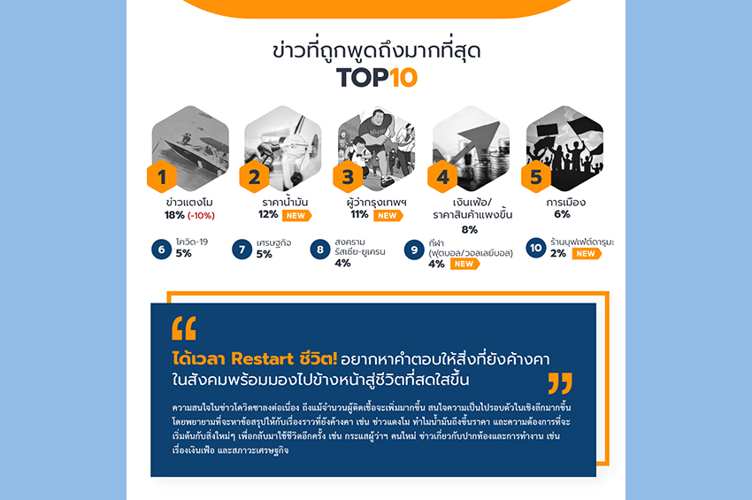 ความสนใจข่าวที่เกี่ยวข้องกับโควิดฯ ซาลงอย่างต่อเนื่อง ในขณะที่ให้ความสนใจกับการเปลี่ยนแปลง และเริ่มต้นกับสิ่งใหม่ๆ เพื่อกลับมาใช้ชีวิตอีกครั้ง เช่น กระแสผู้ว่าฯ คนใหม่ ข่าวเกี่ยวกับปากท้อง เงินเฟ้อ และสภาวะเศรษฐกิจ