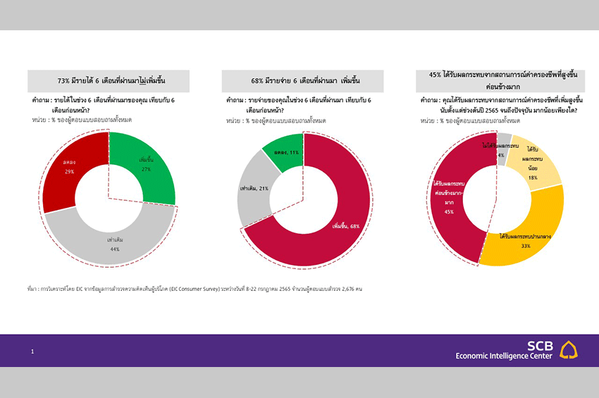 ซึ่งเมื่อพิจารณาตามรายได้ พบว่า กลุ่มรายได้น้อย (รายได้ไม่เกิน 1.5 หมื่นบาทต่อเดือน) มีสัดส่วนผู้ที่รายได้ไม่เพิ่มขึ้นสูงที่สุด - ขณะที่ผู้บริโภคส่วนใหญ่มีรายจ่ายเพิ่มมากขึ้นในช่วงที่ผ่านมา สะท้อนถึงภาวะค่าครองชีพที่เร่งตัว โดยกว่า 68% ของผู้ตอบแบบสอบถามระบุว่า ตนเองมีรายจ่ายเพิ่มขึ้นในช่วง 6 เดือนที่ผ่านมา และเกือบ 1 ใน 4 มองว่า รายจ่ายของตนเพิ่มขึ้นมากกว่า 10% ซึ่งการเพิ่มขึ้นของรายจ่ายนั้นเกิดกับผู้บริโภคในทุกกลุ่มรายได้ในสัดส่วนที่ใกล้เคียงกัน