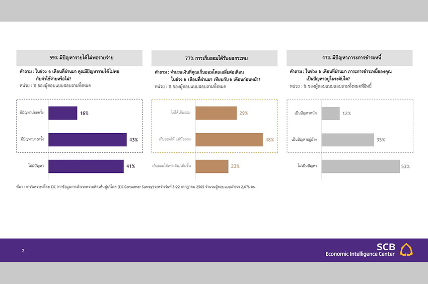 ประเด็นที่สอง : “รายได้ที่โตไม่ทันกับรายจ่ายที่เพิ่มสูงขึ้น ส่งผลให้ในช่วง 6 เดือนที่ผ่านมา คนส่วนใหญ่มีปัญหารายได้ไม่พอกับรายจ่าย ซึ่งส่งผลกระทบต่อเนื่องทำให้การเก็บออมลดลง และคนเกือบครึ่งมีปัญหาด้านภาระการชำระหนี้”