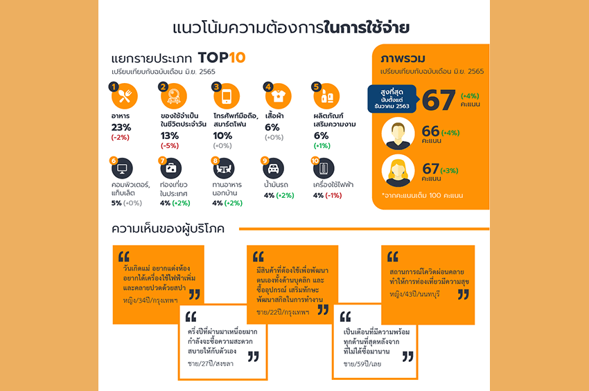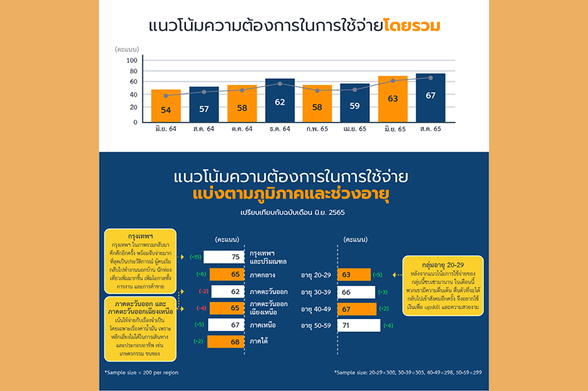 จากผลสำรวจในเดือนสิงหาคม พ.ศ. 2565 พบว่า แนวโน้มความต้องการในการใช้จ่ายโดยรวมเพิ่มสูงสุดที่ 67% โดยเฉพาะชาวกรุงเทพฯและปริมณฑลเพิ่มขึ้นถึงร้อยละ 15 อีกทั้งแนวโน้มความต้องการในการใช้จ่ายของคนไทยเริ่มมีการเปลี่ยนแปลง ไม่เพียงมองหาแต่ของใช้ที่จำเป็นหรืออาหารเพื่อดำรงชีพอีกต่อไป แต่ผู้บริโภคเริ่มมองหาการซื้อความสุขให้ตนเอง เพิ่มโอกาสในการออกไปท่องเที่ยว เข้าสังคม สังสรรค์ ทานอาหารนอกบ้าน ออกไปใช้ชีวิตเต็มที่ เติมความสุขให้ตนเองและครอบครัว โดยเฉพาะกลุ่มอายุ 20-29 ที่ซบเซามานาน