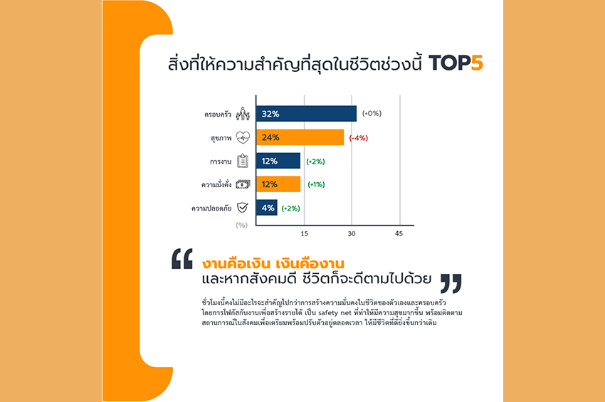 ‘งานคือเงิน เงินคืองาน’ สิ่งที่คนไทยให้ความสำคัญที่สุดในช่วงนี้ คือ เรื่องงานและเงิน เพราะเน้นสร้างความมั่นคง มีเงินใช้จ่ายได้เต็มที่ สร้างความสุขให้ตัวเลขและครอบครัว