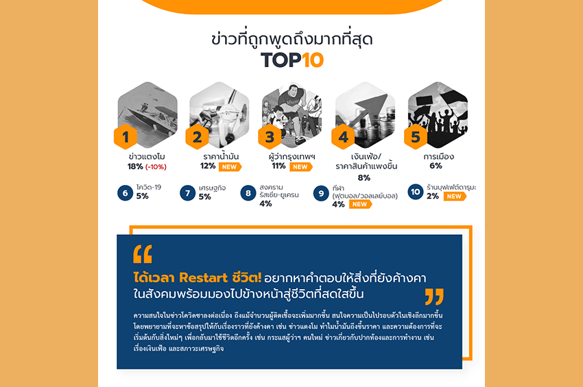 ความสนใจข่าวที่เกี่ยวข้องกับโควิดฯ ซาลงอย่างต่อเนื่อง ในขณะที่ให้ความสนใจกับการเปลี่ยนแปลง และเริ่มต้นกับสิ่งใหม่ๆ เพื่อกลับมาใช้ชีวิตอีกครั้ง เช่น กระแสผู้ว่าฯ คนใหม่ ข่าวเกี่ยวกับปากท้อง เงินเฟ้อ และสภาวะเศรษฐกิจ