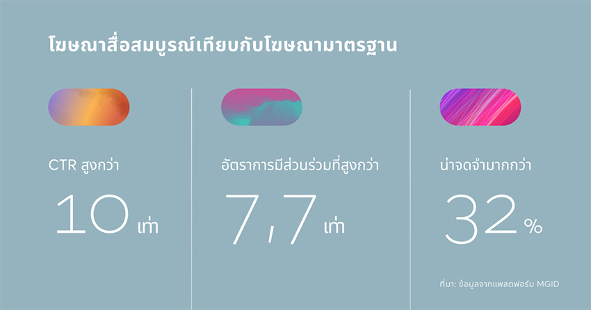 ทำให้พิจารณาได้ว่าโฆษณาสื่อสมบูรณ์มีประสิทธิภาพดีกว่าโฆษณาแบนเนอร์มาตรฐานมากถึง 267% ในบางกรณี ชัดเจนว่าทรัพยากรของคุณถูกใช้ไปอย่างคุ้มค่า มีอีกหนึ่งกรณีศึกษาพบว่าการคลิกออกจากหน้าเว็บทันทีของผู้ใช้ลดลง 34% และจากผลลัพธ์ของแคมเปญของเรา แสดงว่าโฆษณาสื่อสมบูรณ์มีอัตราการคลิกผ่าน (CTR) สูงกว่าถึงสิบเท่า MGID ยังมีทีมนักออกแบบและนักเขียนคำโฆษณาเพื่อสร้างโฆษณาสื่อสมบูรณ์ตามความต้องการเฉพาะของแต่ละแบรนด์หรือเอเจนซี่คอยให้บริการอีกด้วย