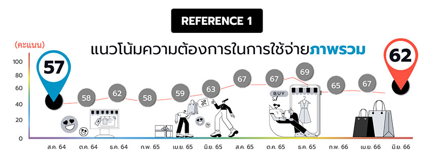 เมื่อเทียบกับผลสำรวจของเดือนกุมภาพันธ์และเดือนเมษายน 2566 ที่ผ่านมา ทำให้เห็นได้ชัดว่า คนไทยผ่านการเฉลิมฉลองในช่วงเทศกาลและใช้เงินกันมาอย่างหนักหน่วง เนื่องจากปีนี้เองเป็นปีแรกในรอบ 3 ปี ที่คนไทยได้กลับมาเฉลิมฉลองกันอย่างเต็มที่โดยไม่กังวลเรื่องการแพร่ระบาดของโควิด นั่นจึงเป็นเหตุผลสำคัญที่แสดงให้เห็นว่า เมื่อเข้าสู่ช่วงเดือนมิถุนายนหรือกลางปี มีการส่งสัญญาณจากเงินในบัญชีว่าให้พักเรื่องการใช้จ่าย ซึ่งส่งผลโดยตรงกับคะแนนความต้องการใช้จ่ายในภาพรวมที่ลดลง อีกหนึ่งผลกระทบที่ทำให้ใครหลายคนต้องเซฟเงินในบัญชีคือเรื่องสินค้าราคาแพงและค่าไฟในช่วงนี้สูงขึ้นกว่าหลายๆ เดือนที่ผ่านมา